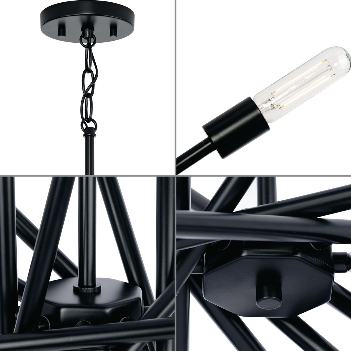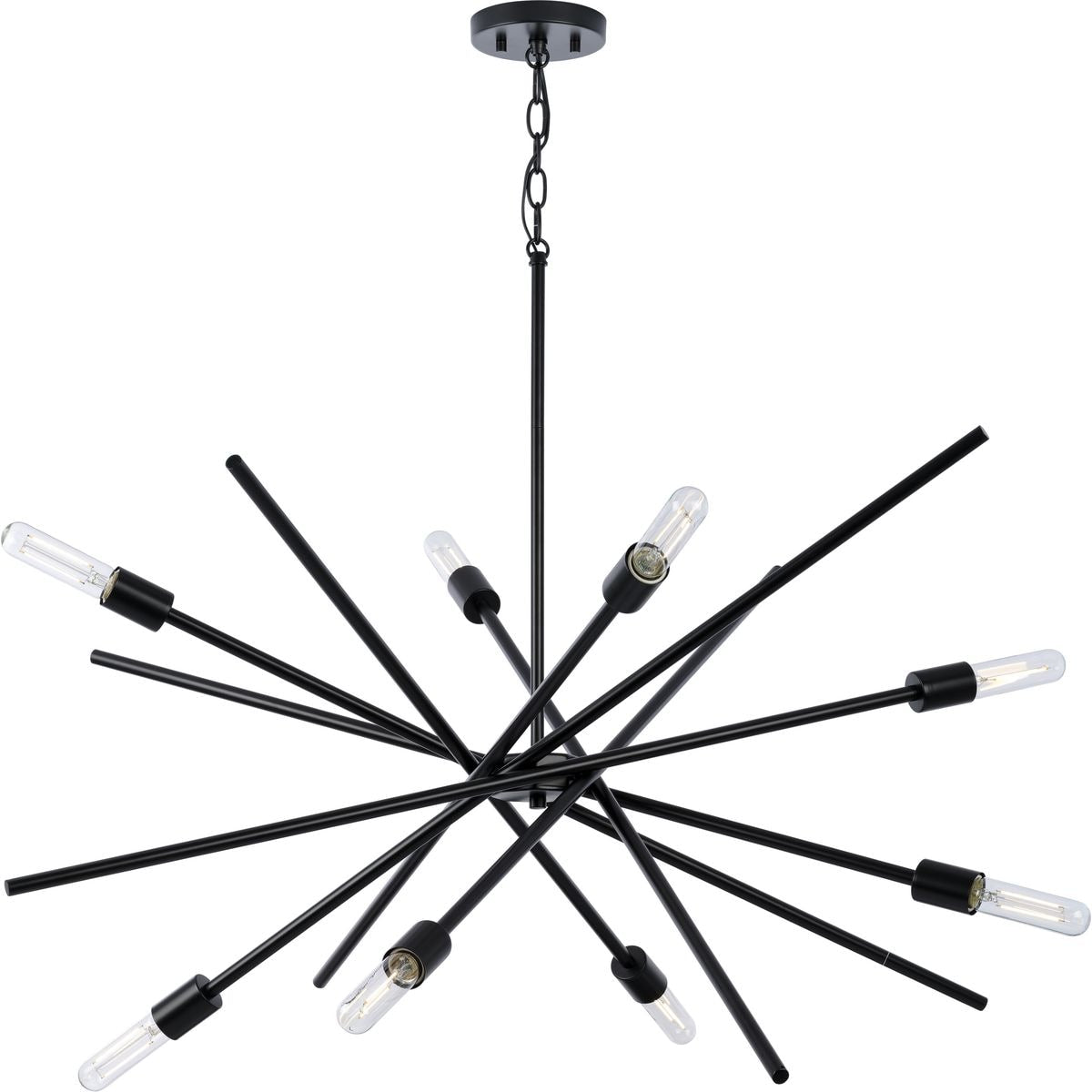 The Astra 8-Light Matte Black Chandelier blends a space-age design with modern elegance, perfect for enhancing any contemporary or mid-century-modern space. With eight dynamically positioned spoked arms and a sophisticated matte black finish, this fixture is an ideal statement piece for dining rooms, kitchens, and bedrooms.