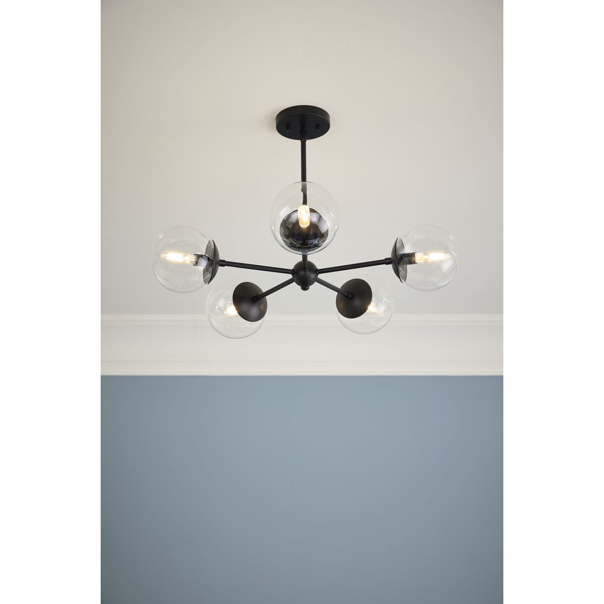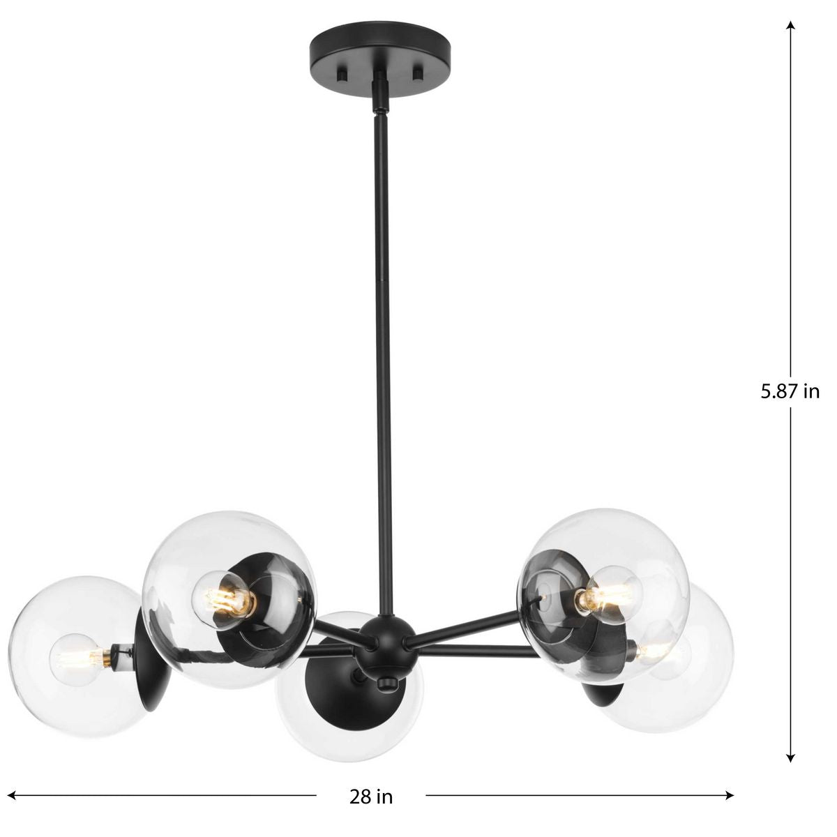 Elevate your space with the Atwell 5-Light Matte Black Mid-century Chandelier. Its sleek design and clear glass globe shades capture the essence of modern sophistication, while providing ample and brilliant lighting. Ideal for various settings, it seamlessly complements both contemporary and mid-century modern interiors.