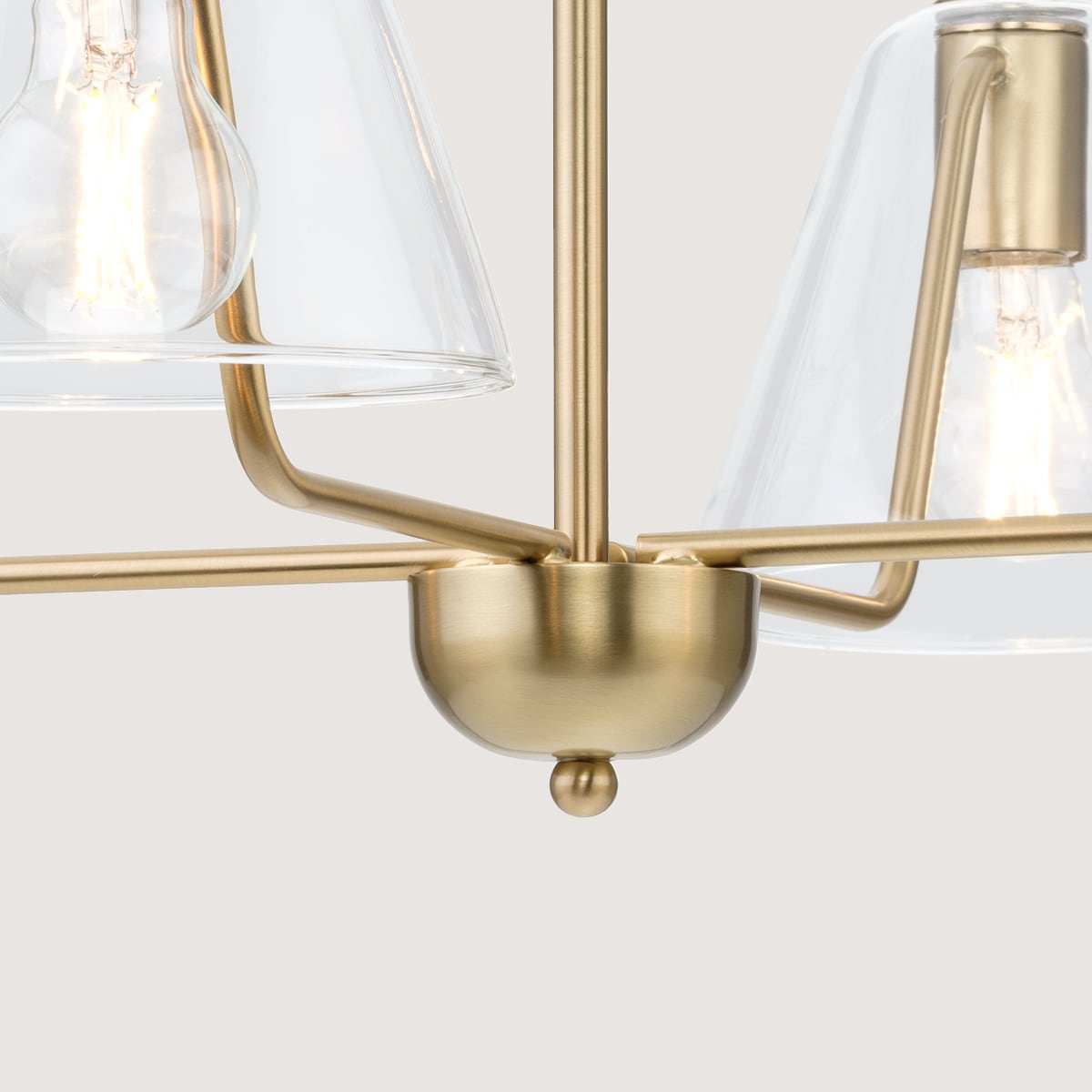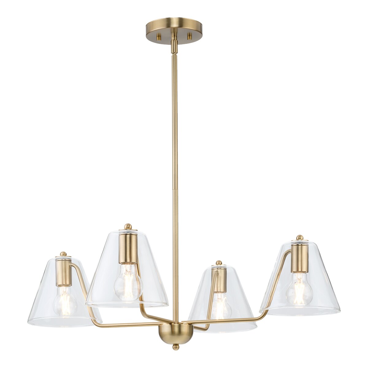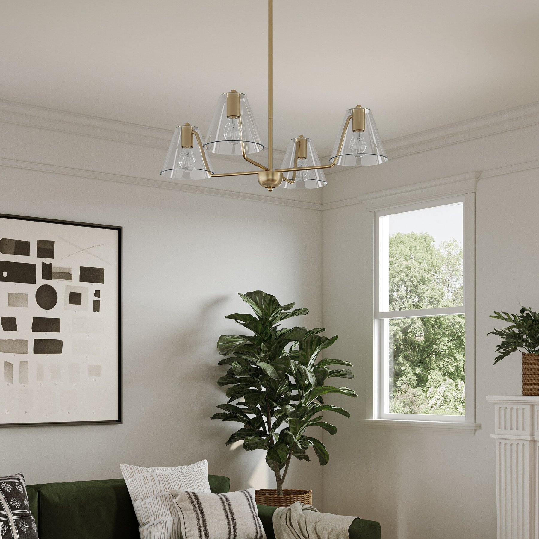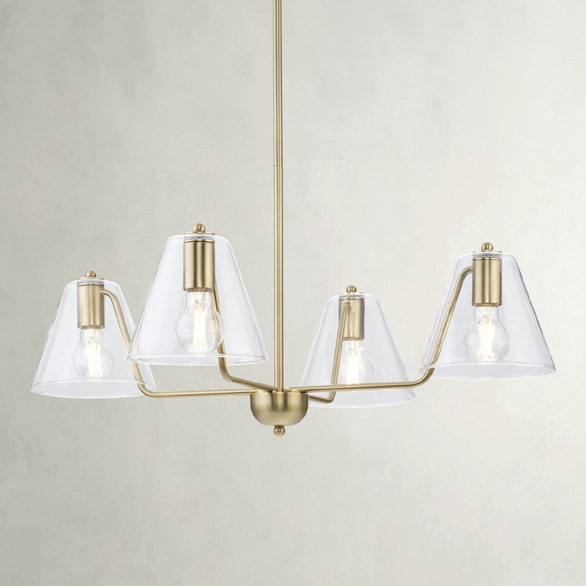 The Avec 4-Light Chandelier offers a transformative presence with its sleek lines and lustrous brushed gold finish. Its angular glass shades create a captivating glow, reminiscent of a radiant sunrise encapsulated in glass. Style it above a grand dining table or allow it to shine in an expansive foyer, setting the stage for refined living. This chandelier not only lights up your space but elevates it to a realm of modern sophistication.