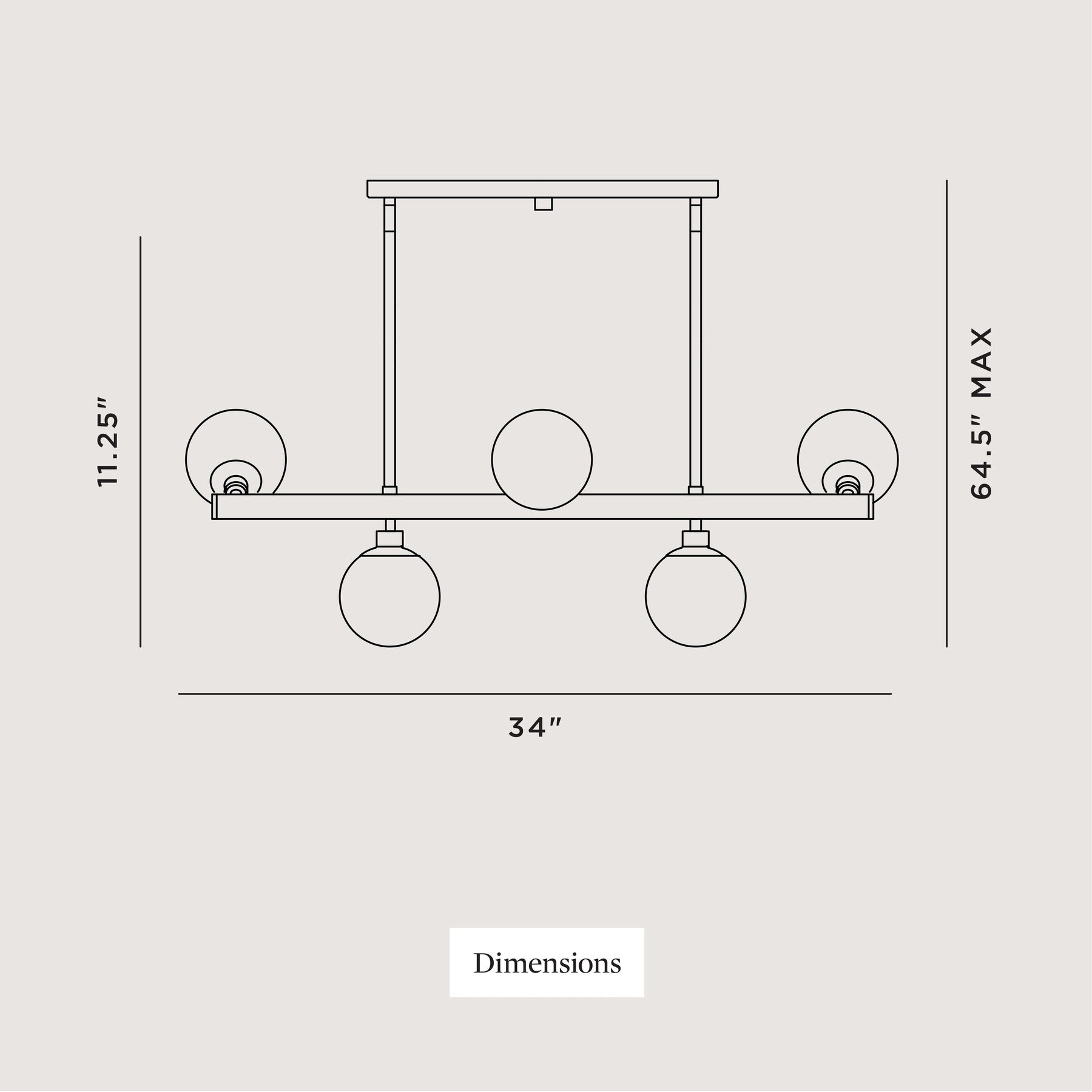 A: The chandelier measures 34 inches in width, 12.25 inches in depth, and has an installed height adjustable up to 64.5 inches.