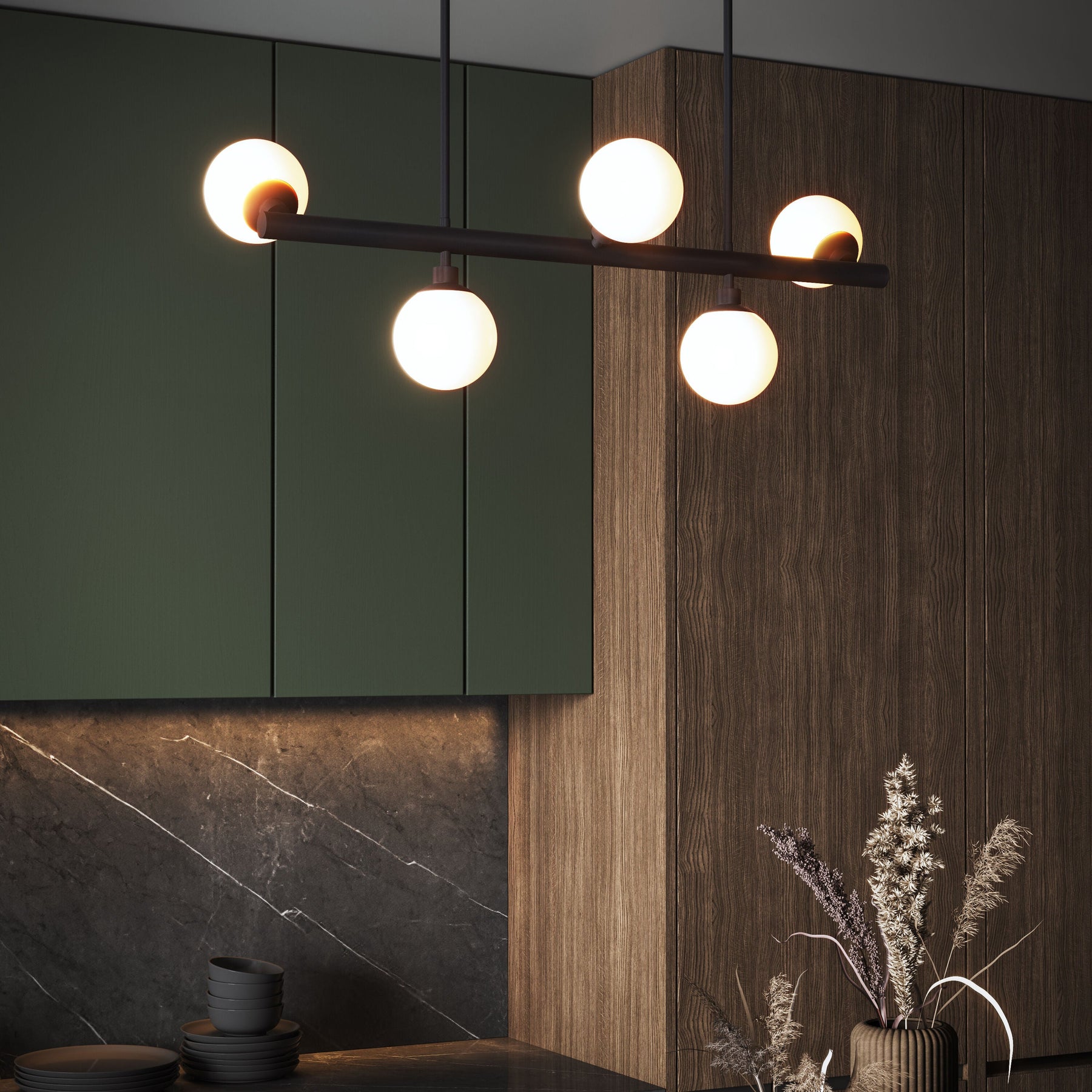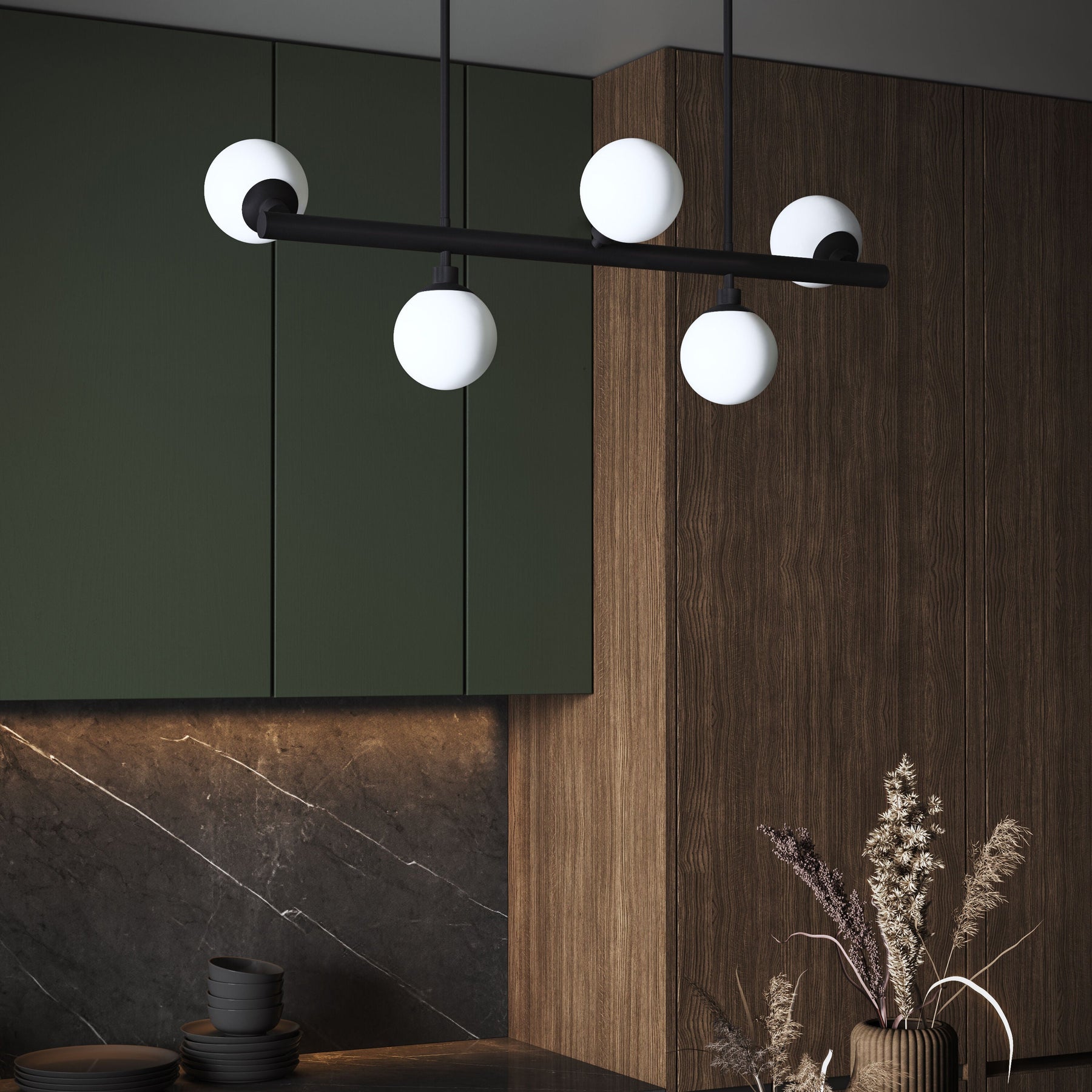 Envision a space transformed by the Avec 5-Light, where artistry meets function in exquisite balance. The matte black finish exudes modern elegance, making a bold statement over any kitchen island or dining table. The ethereal white glass shades disperse light in a gentle glow, turning ordinary moments into elevated experiences. Imagine accentuating this masterpiece with metallic touches for a touch of glamour, crafting a setting that speaks to sophistication and luxury living.