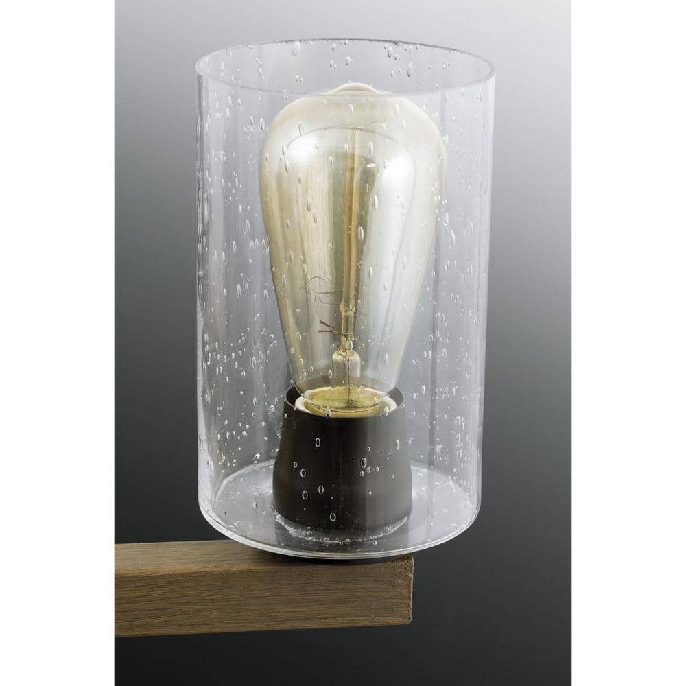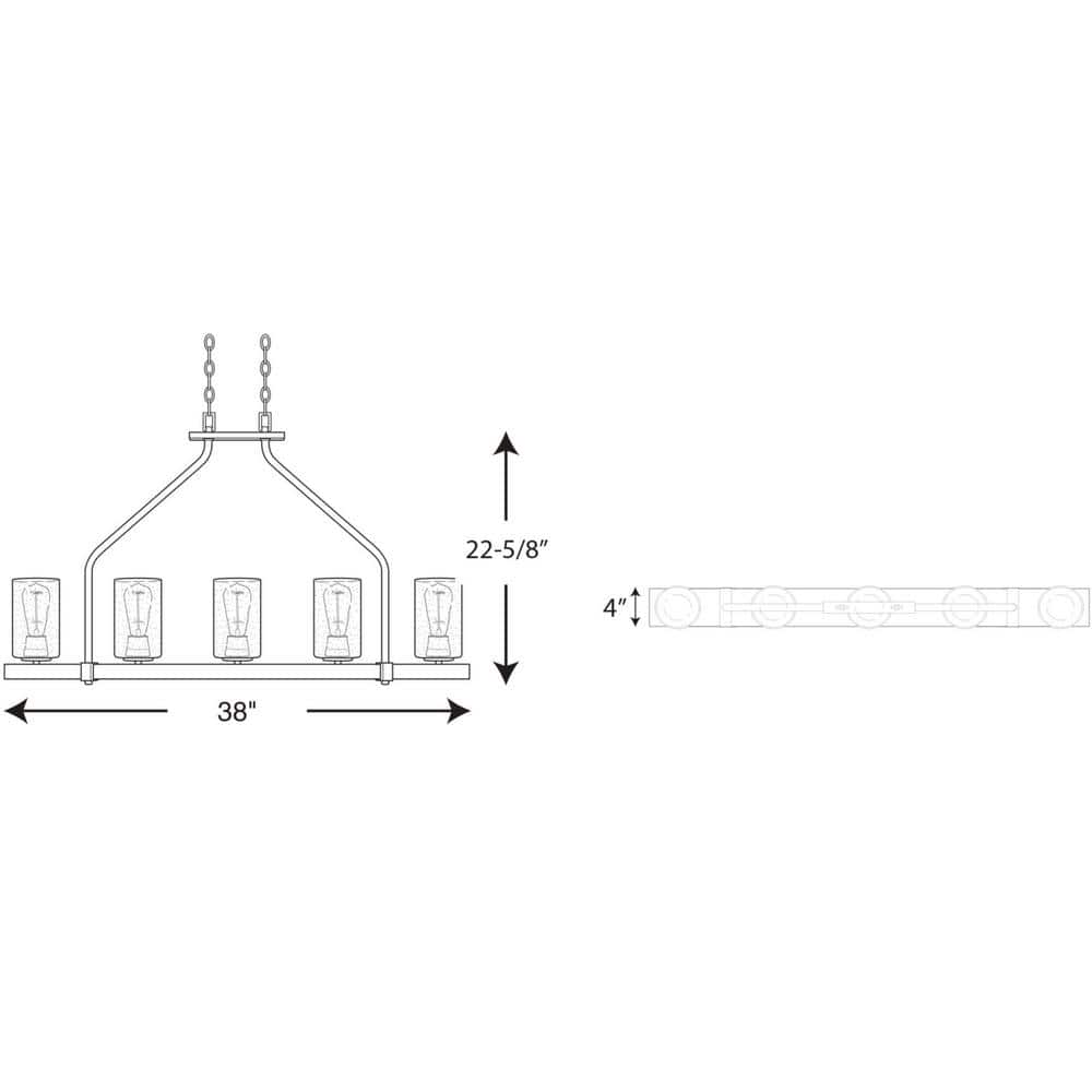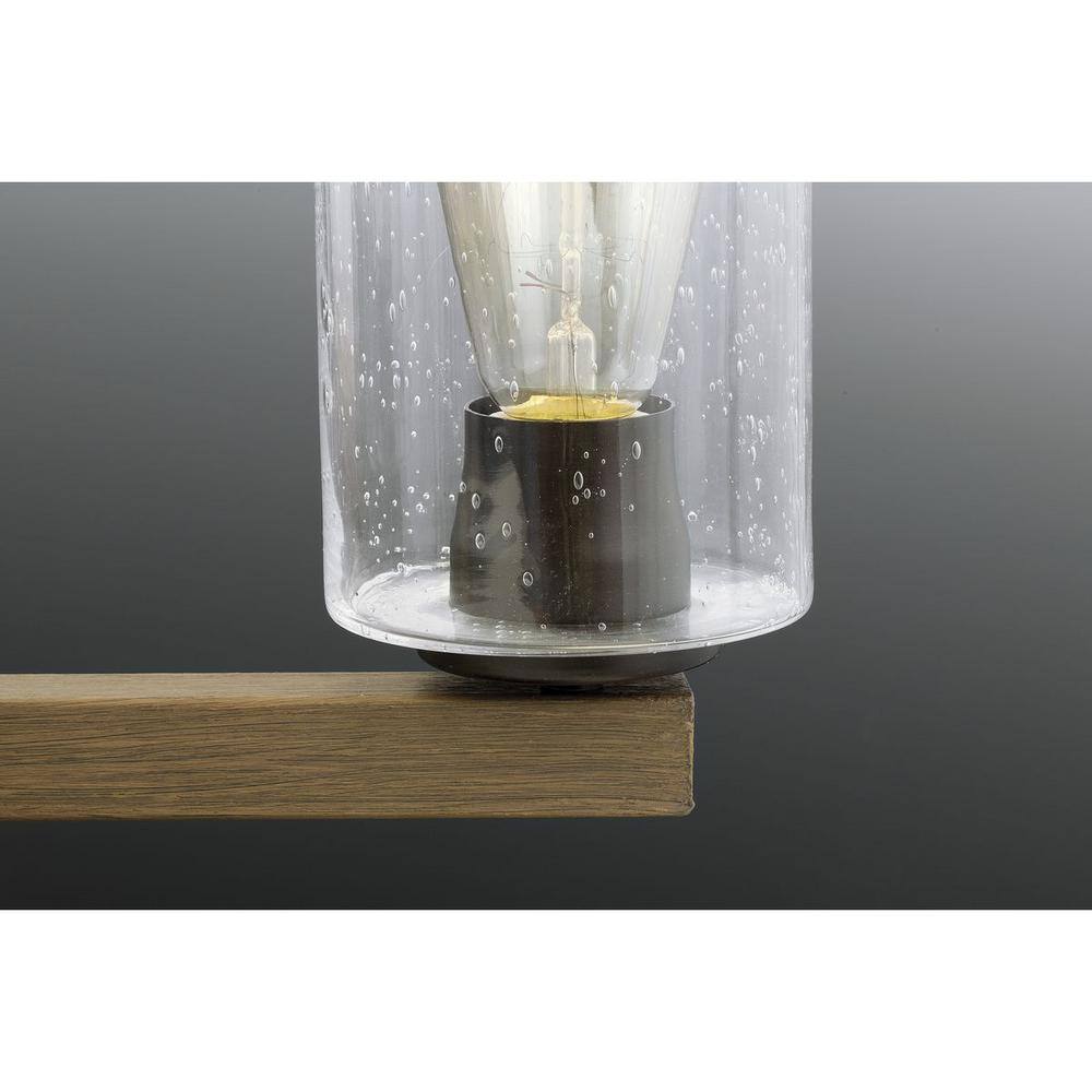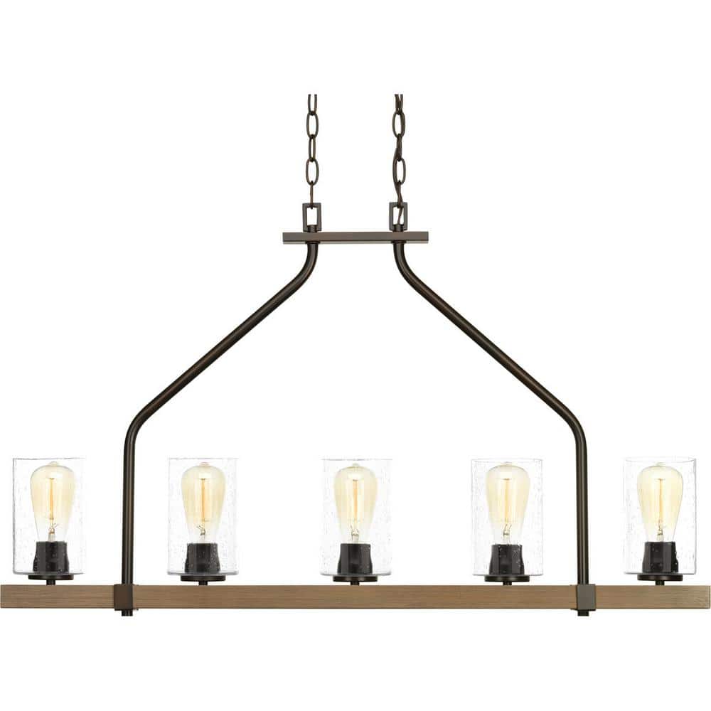 The Progress Lighting Barnes Mill Collection 5-Light Chandelier offers a stunning combination of rustic charm and modern elegance. Featuring an antique bronze finish, it showcases clear seeded glass shades suspended from a faux-painted wooden plank. This charming chandelier is perfect for adding a vintage appeal to any room.