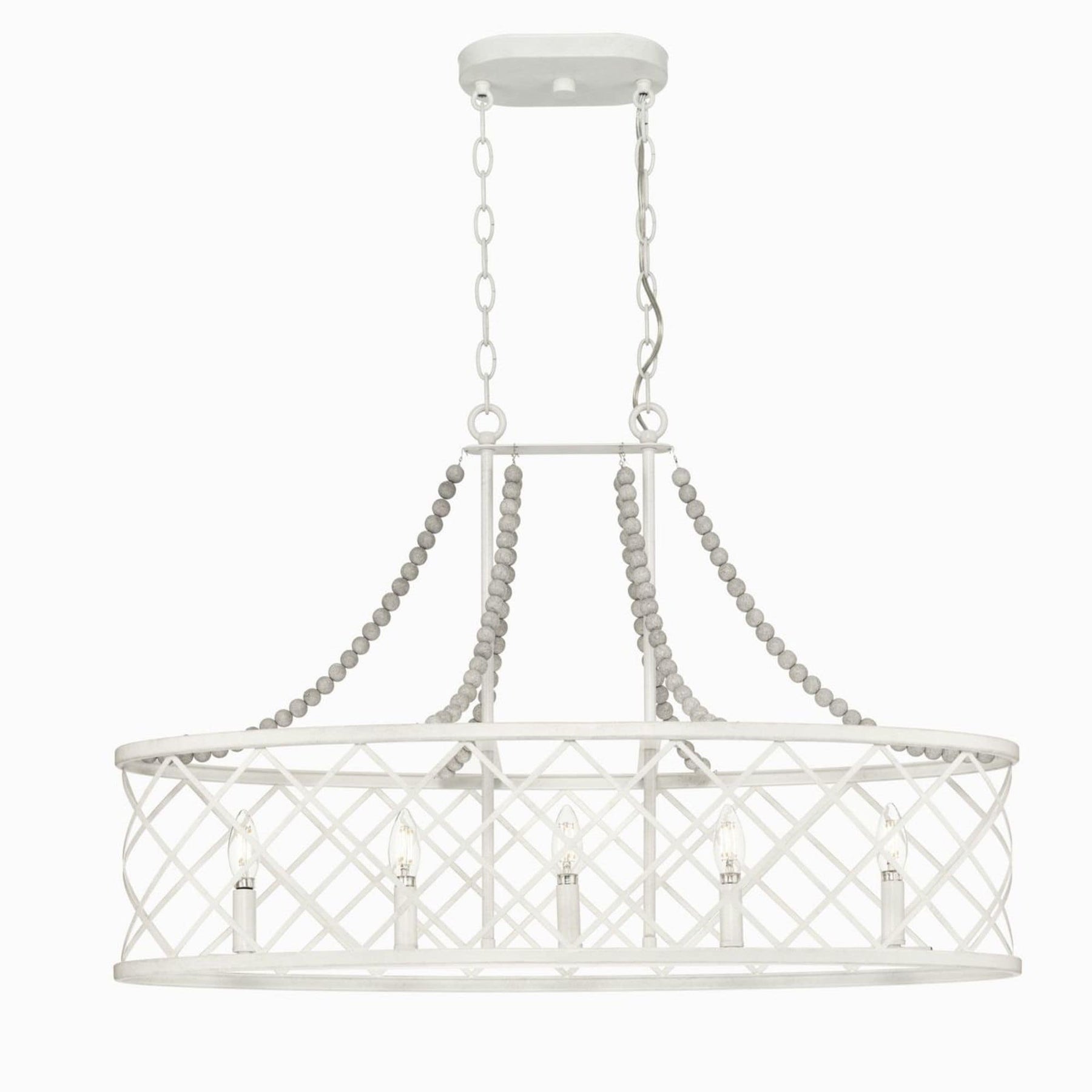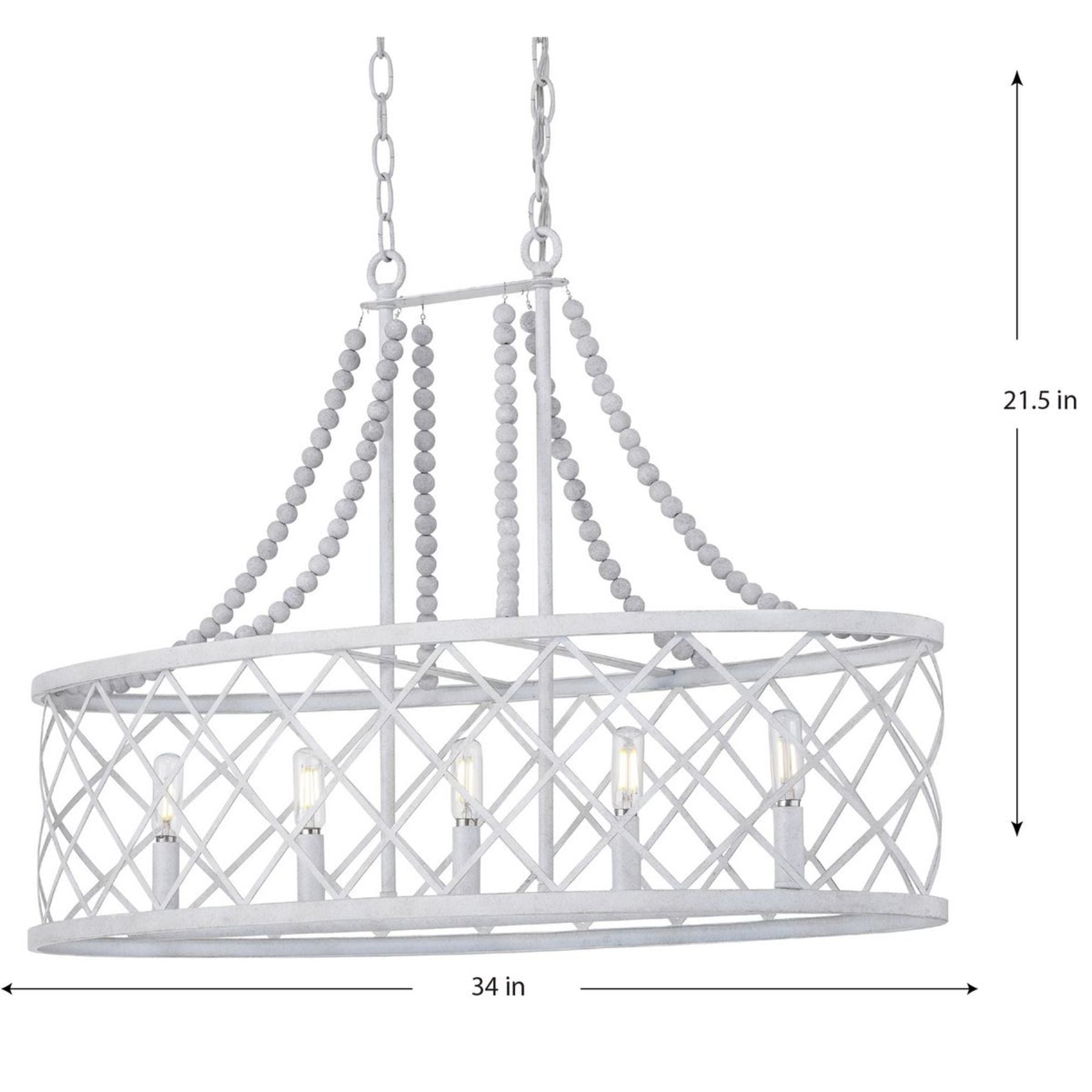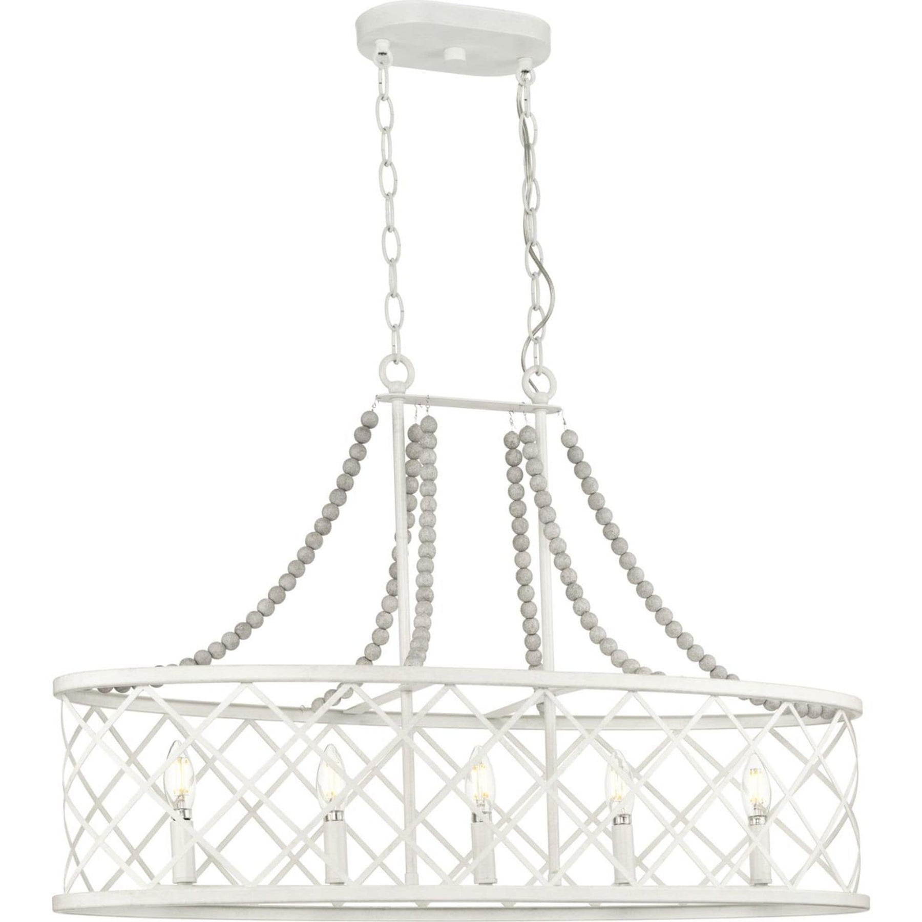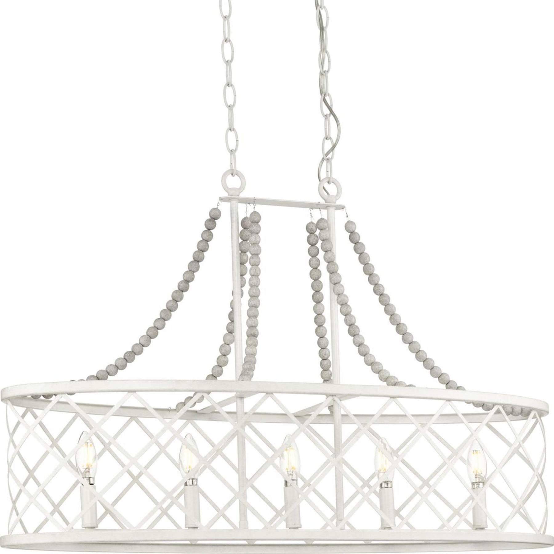Elevate your interior décor with the Progress Lighting Bisset 5-Light White Coastal Chandelier, a sophisticated lighting fixture that combines coastal charm with modern elegance. Its textured cottage white finish and whitewashed wood beads create an inviting atmosphere, while its adaptable design complements various style themes from modern farmhouse to shabby chic.