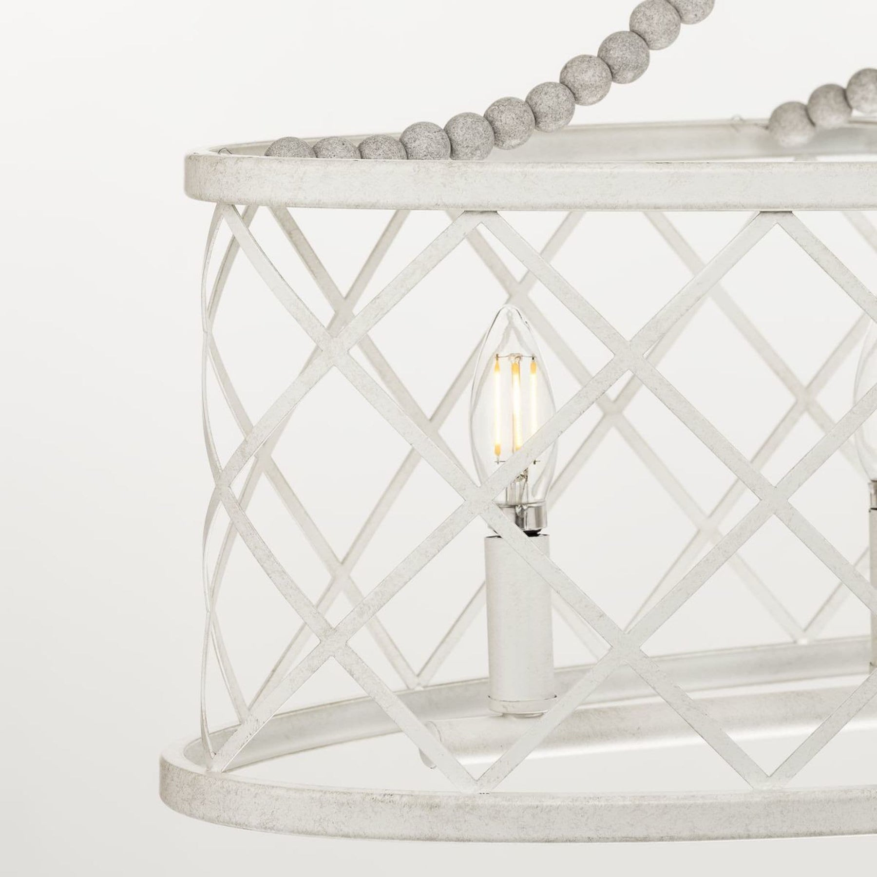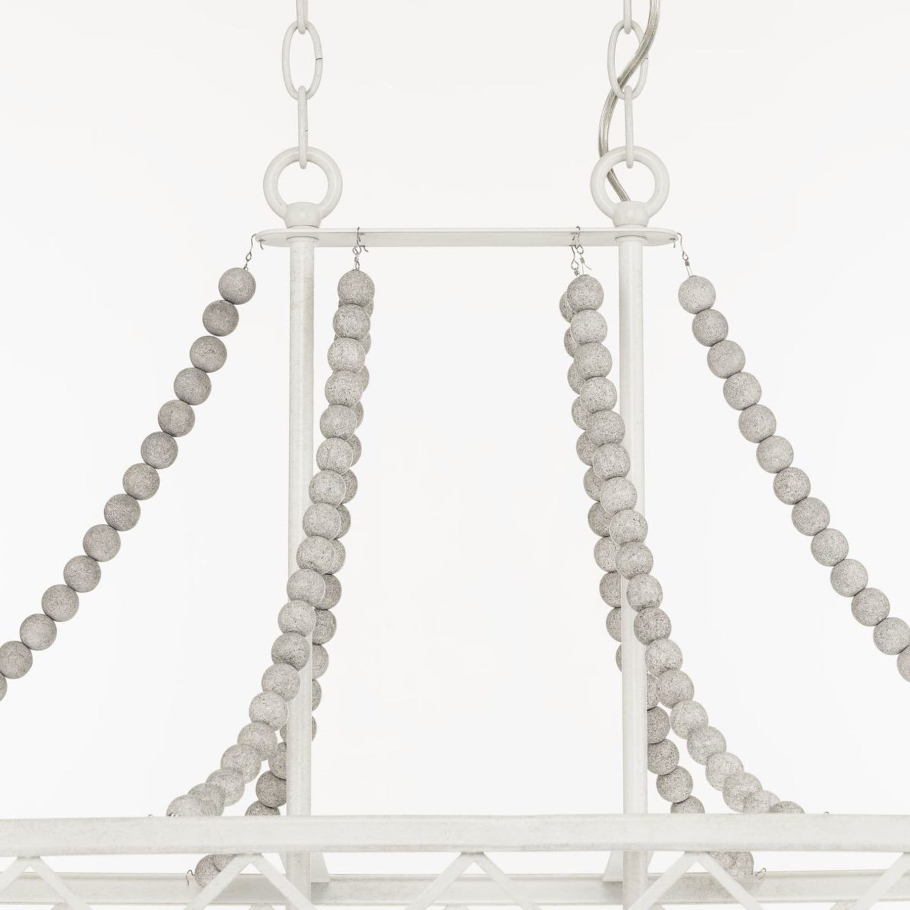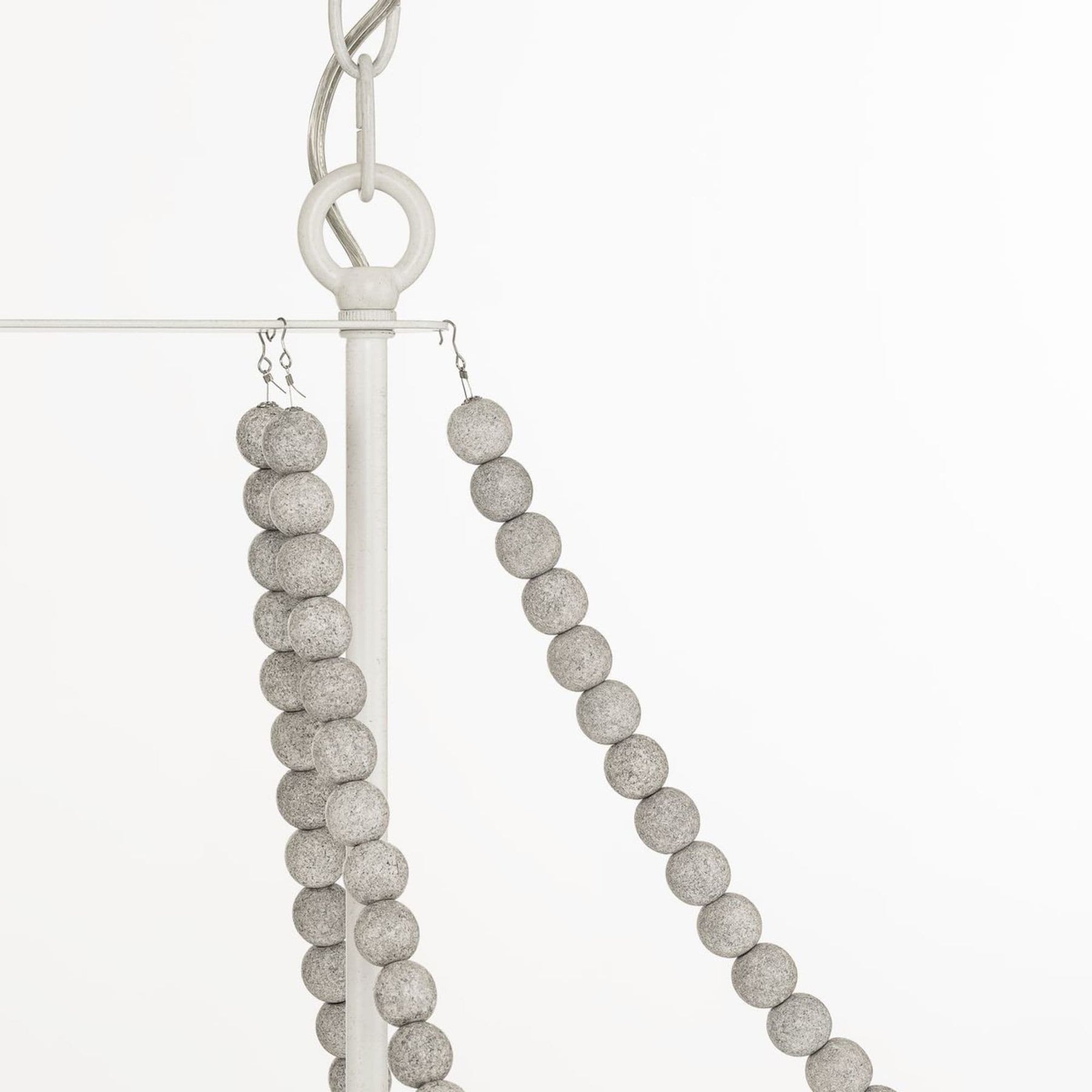 A: The chandelier is constructed from durable steel, finished with a cottage white coating and detailed with gray-washed wood beads.
