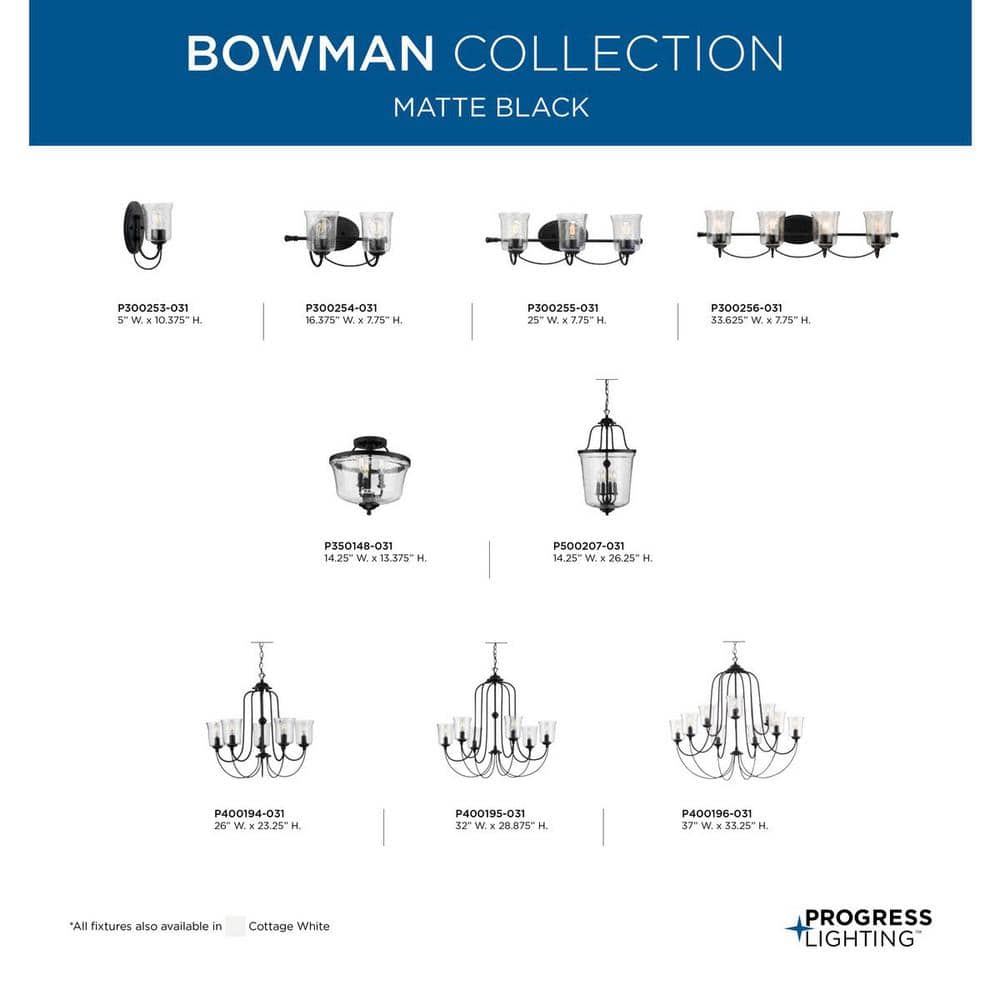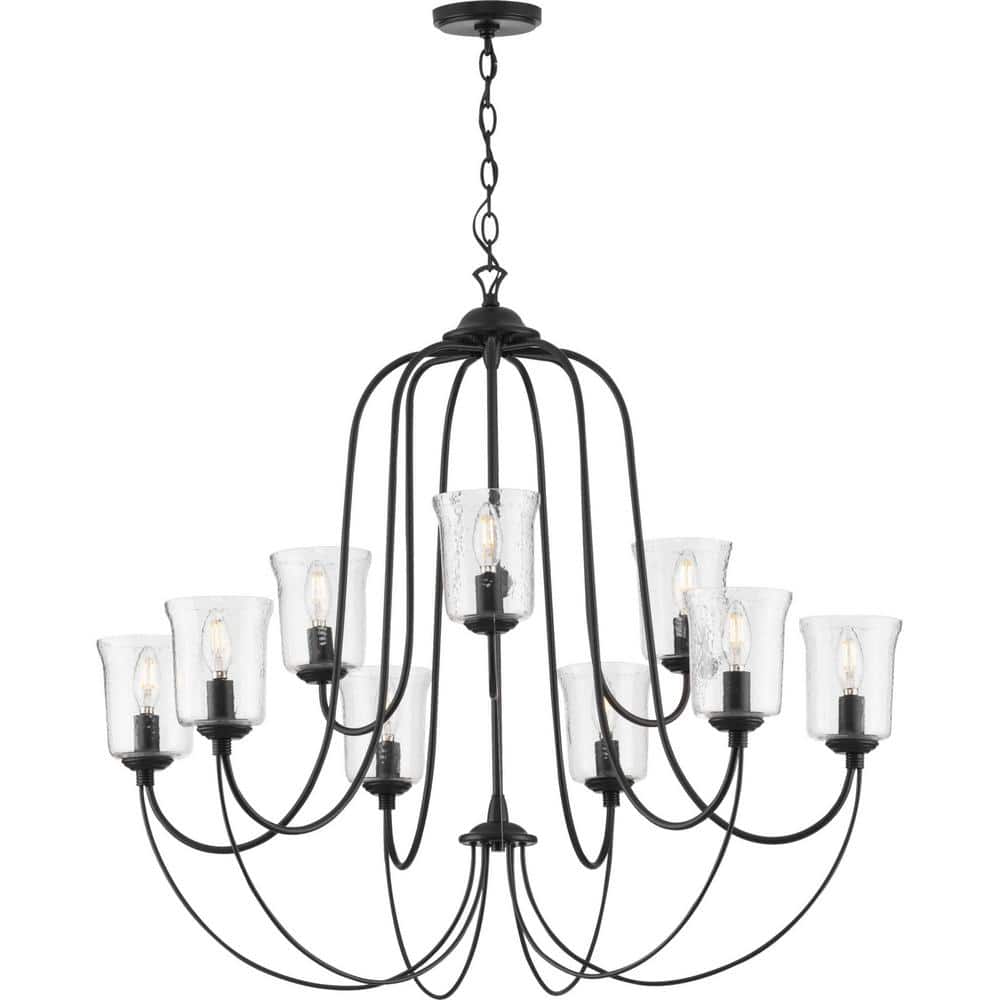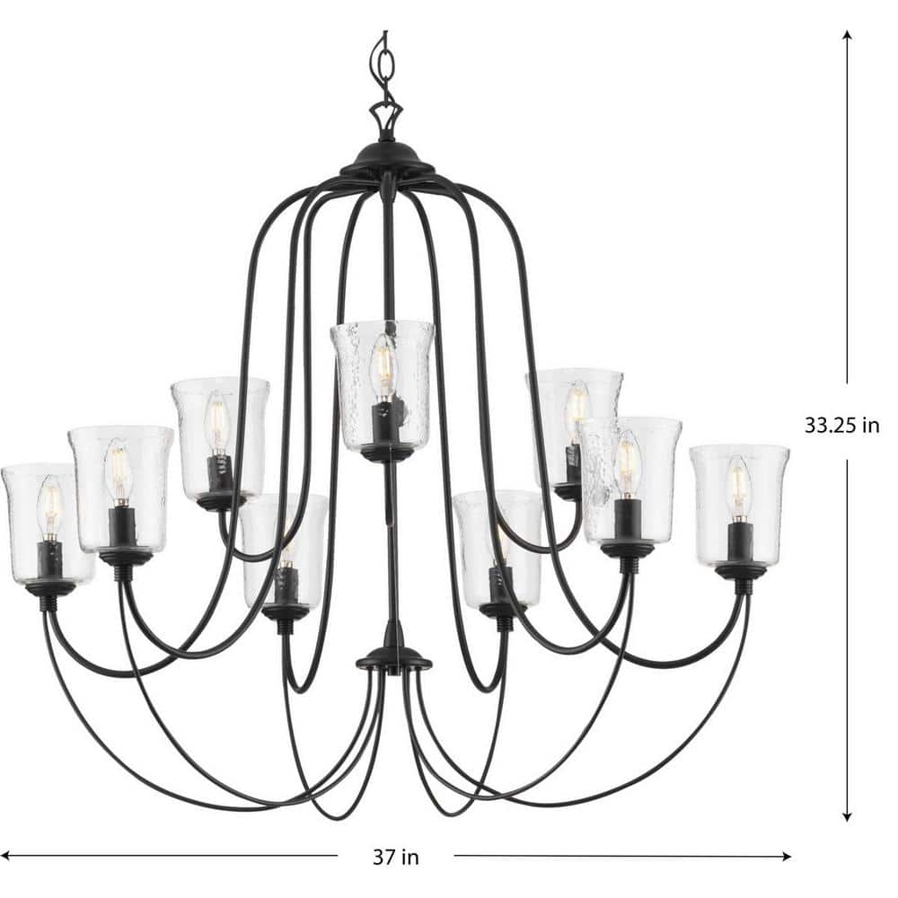 Elevate your space with the sophisticated allure of the Bowman Collection 9-Light Matte Black Coastal Chandelier. Featuring elegant curved arms and clear chiseled glass shades, this striking fixture infuses any room with timeless charm. Perfect for a variety of settings, it effortlessly complements transitional, rustic, farmhouse, or coastal interiors.