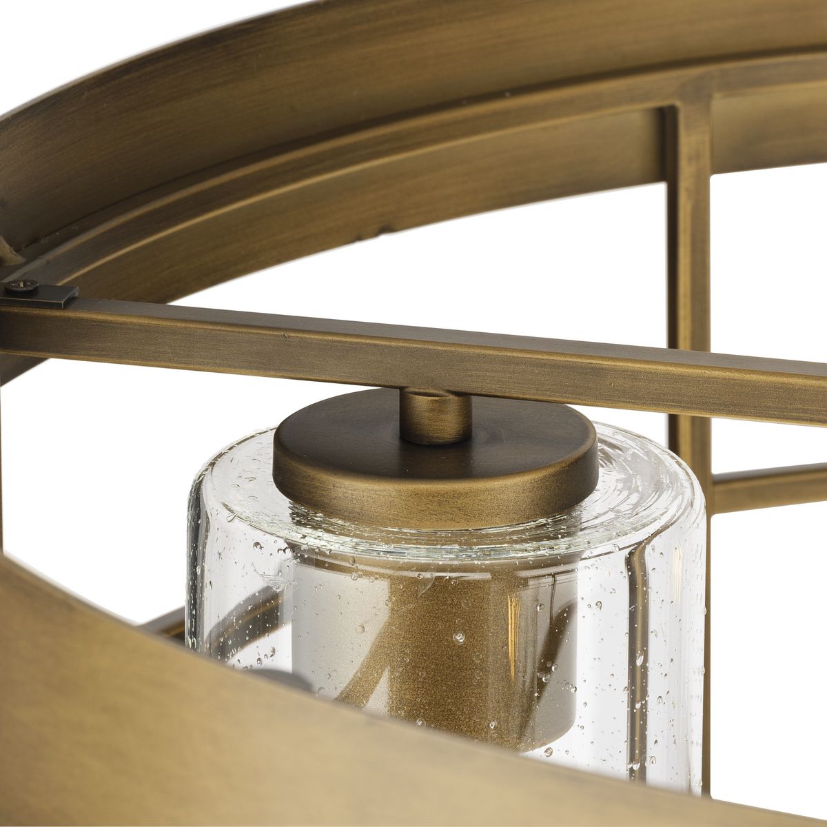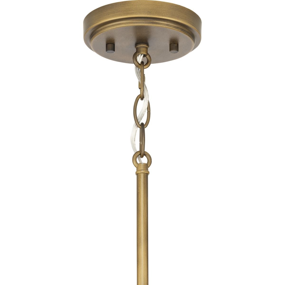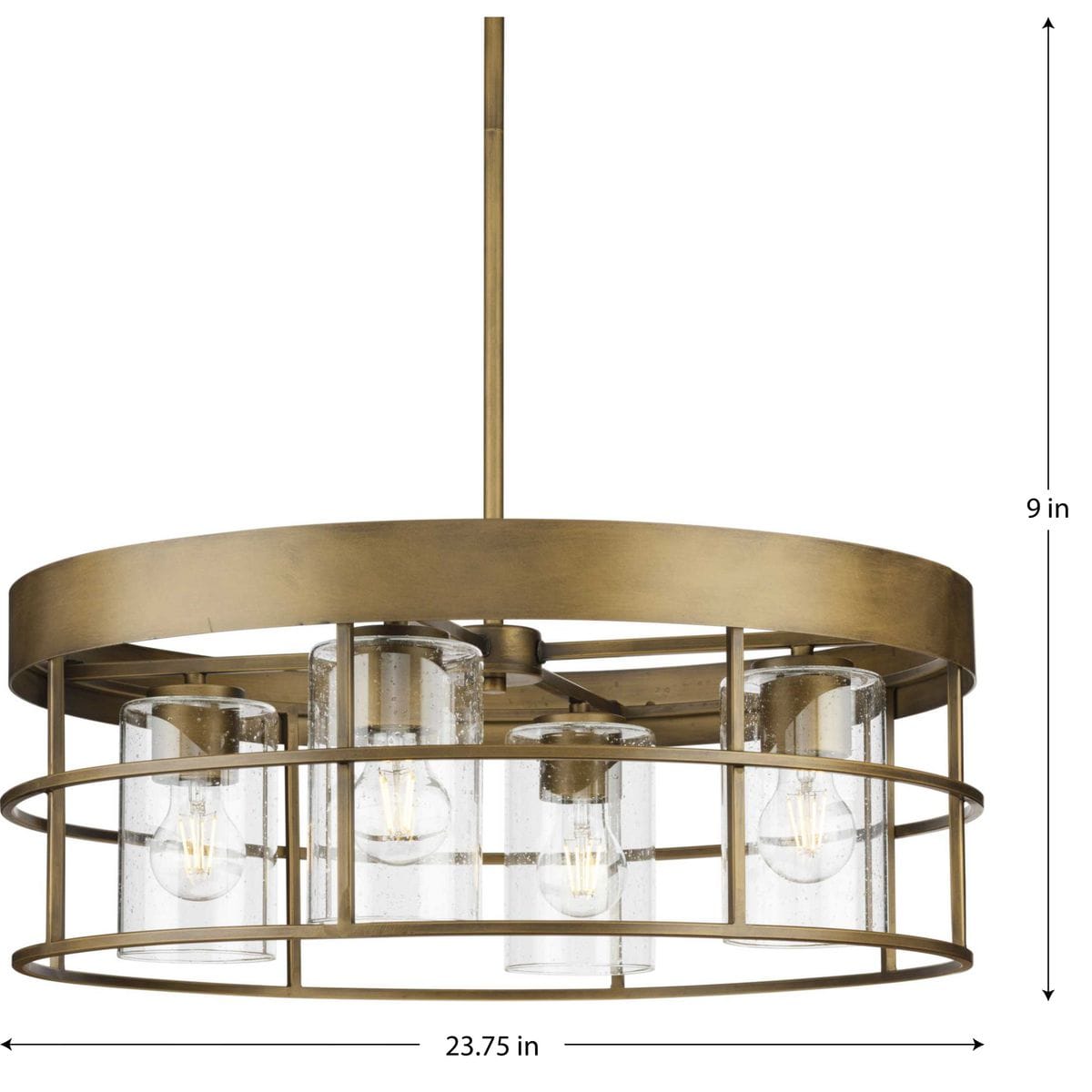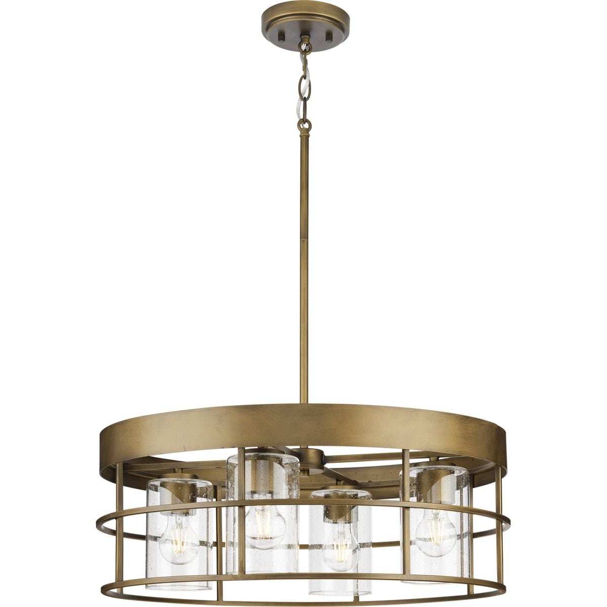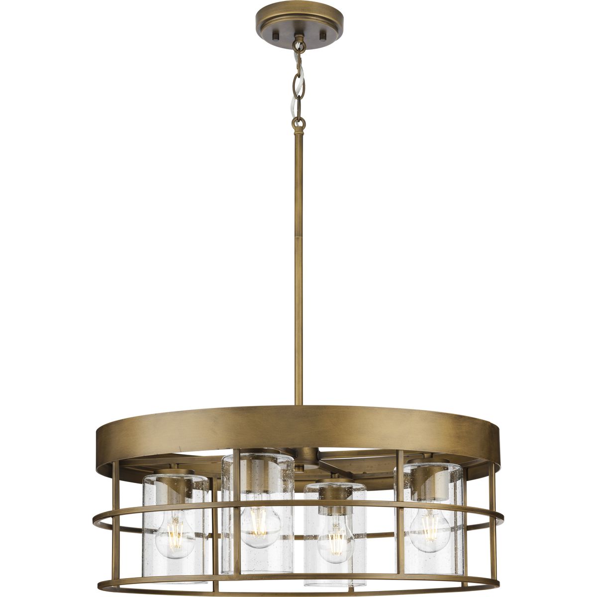 The Burgess 4-Light Bronze Craftsman Chandelier by Progress Lighting adds a touch of vintage charm to any living space with its aged bronze finish and sleek, geometric design. Ideal for a modern farmhouse aesthetic, this fixture provides warm, ambient light through its clear glass shades, accommodating four 60-watt bulbs.