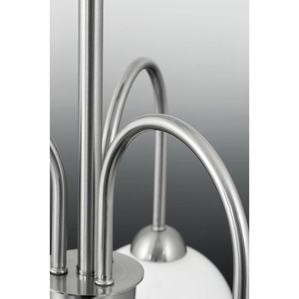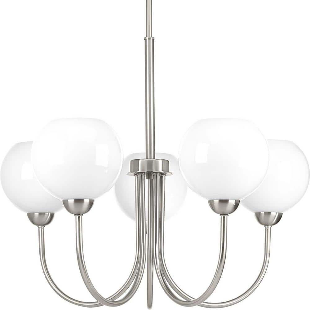 Elevate your space with the Carisa Brushed Nickel 5-Light Chandelier from Progress Lighting. With its mid-century modern design, this chandelier features stunning glossy white glass globes set against a metallic finish, creating a timeless aesthetic. Ideal for dining rooms or living spaces, it offers both ambient illumination and eye-catching decor.