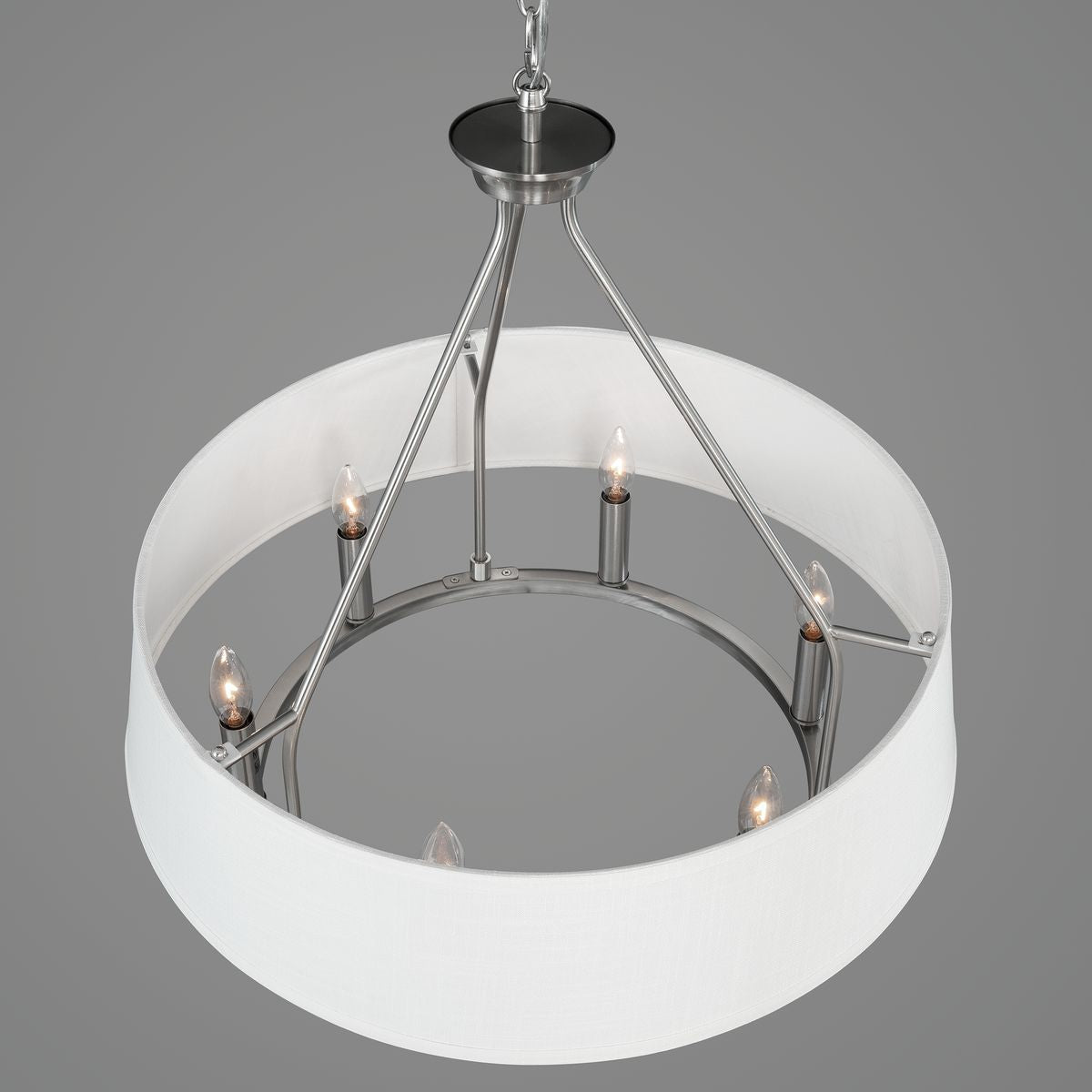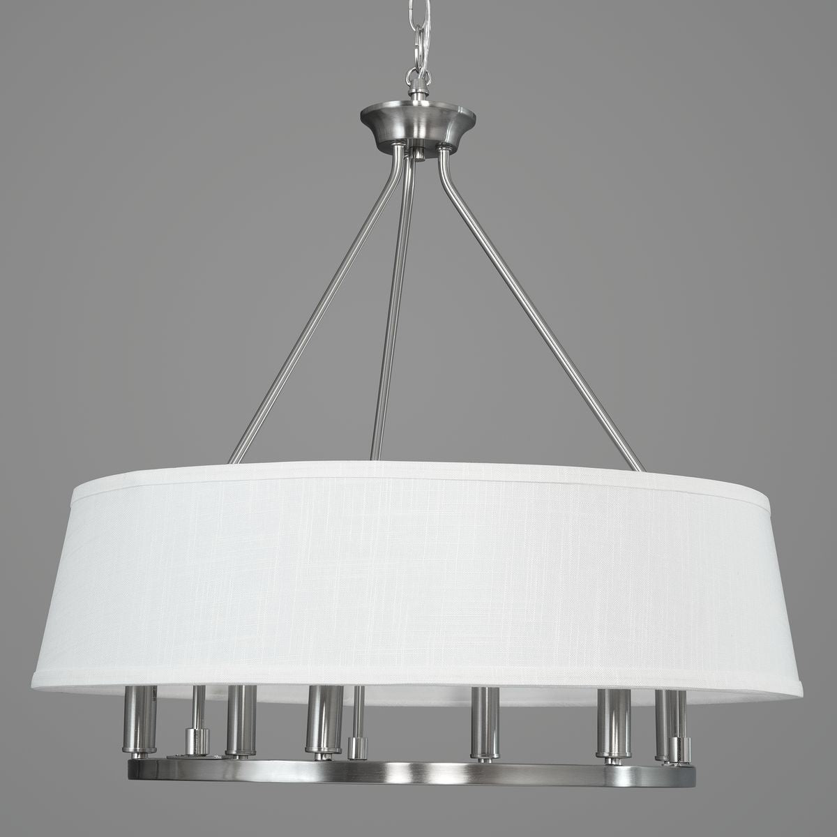 The Cherish Chandelier is more than a light fixture; it's a statement piece that transforms any room into a haven of style and warmth. With its pristine white linen shade and the lustrous brushed nickel frame, it exudes a refined modern charm that's both sophisticated and welcoming. Imagine this chandelier gracing your dining area, where it casts a soft, ambient glow over curated dinners or intimate gatherings. Pair it with natural woods and silken textiles to create an atmosphere that whispers luxury, an essential fixture for those who appreciate the delicate balance of form and function in a home.