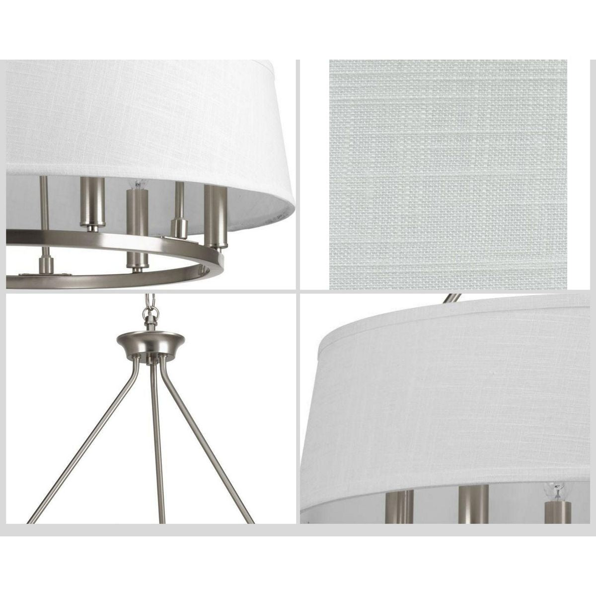 Illuminate your home with the Cherish 6-Light Chandelier from Progress Lighting. This stunning fixture boasts a contemporary brushed nickel finish and a crisp white linen shade to create a warm, inviting glow. Perfect for dining rooms, kitchens, and more, this chandelier is ideal for bringing modern elegance to any space.