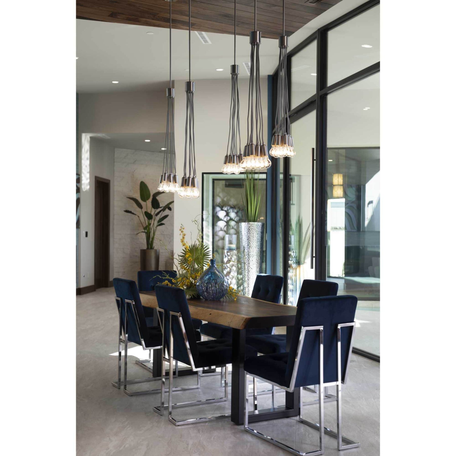 Geometric Design: Features nine suspended lights with a sleek brushed nickel finish.