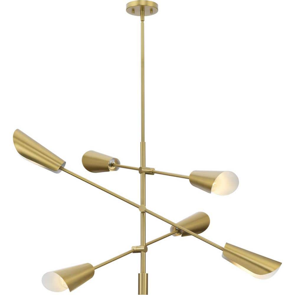 The Cornett 6-Light Brushed Gold Chandelier by Progress Lighting showcases a stunning mid-century modern design, perfect for adding a stylish flair to dining rooms, bedrooms, and great rooms. With its dynamic angles and adjustable arms, this chandelier delivers both form and functionality, offering focused, downward lighting for any modern space.