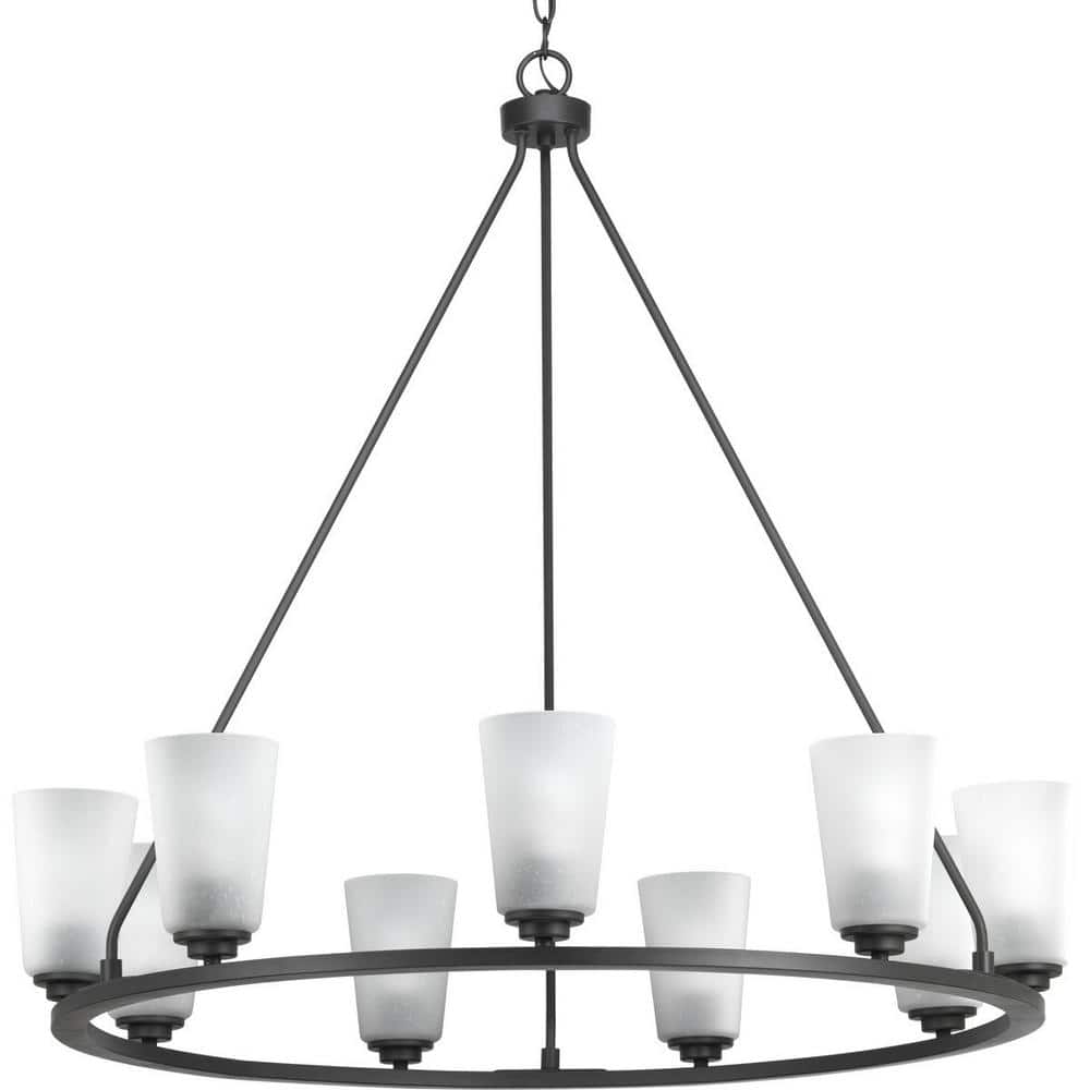 Illuminate your home with the invigorating ambiance of the Debut Collection 9-light chandelier from Progress Lighting. Its bold, graphite-finished circular frame and minimalist design capture the essence of industrial elegance, making it a striking centerpiece for modern interiors. Perfect for enhancing any dining room, foyer, or great room, this chandelier is a versatile and sophisticated addition to your home lighting.