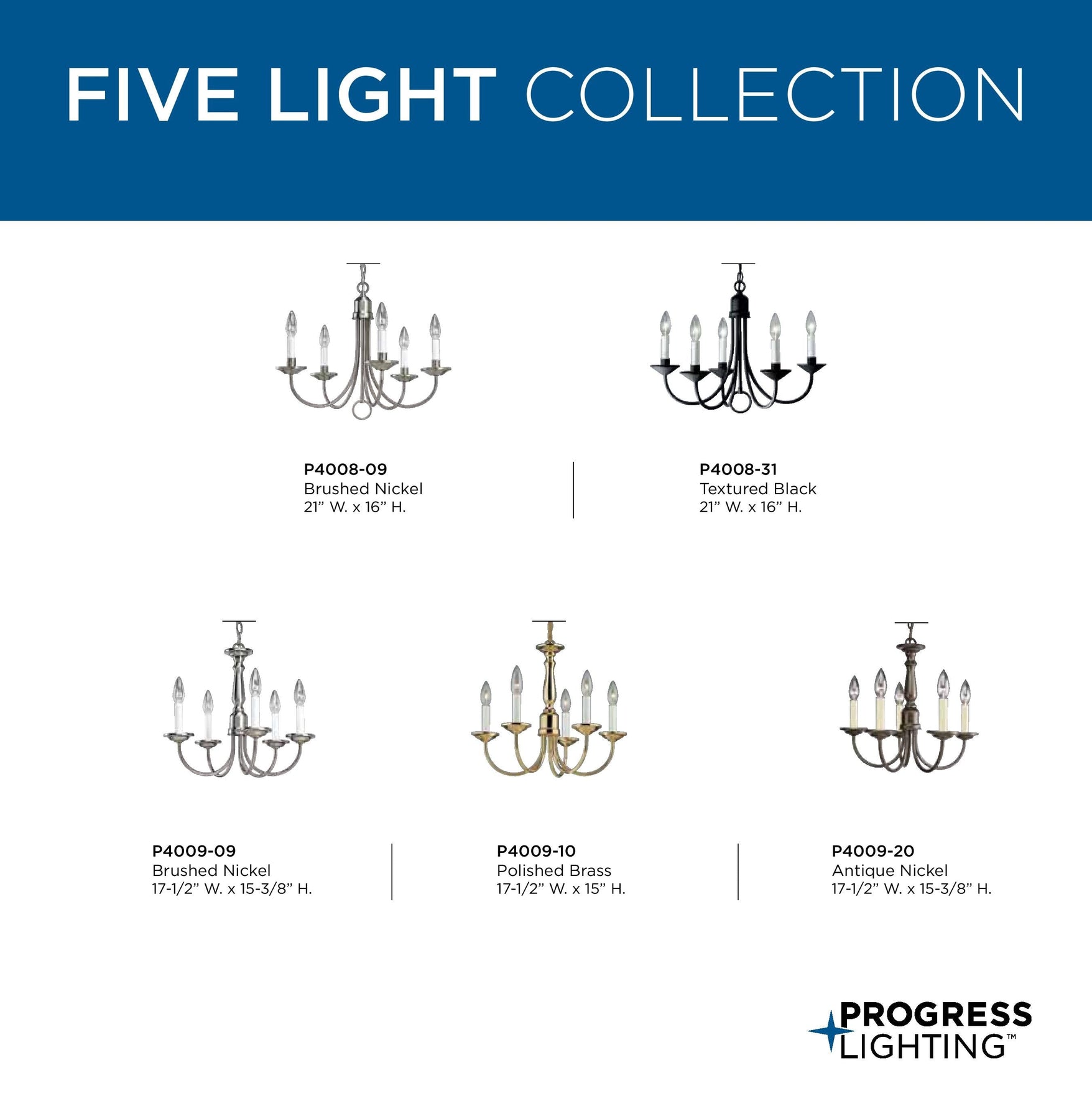Elevate your space with the Progress Lighting Antique Bronze 5-Light Chandelier, merging classic elegance with modern sensibilities. Designed with an exquisite antique bronze finish and complemented by ivory candle sleeves, this chandelier becomes a focal point in any room it adorns.