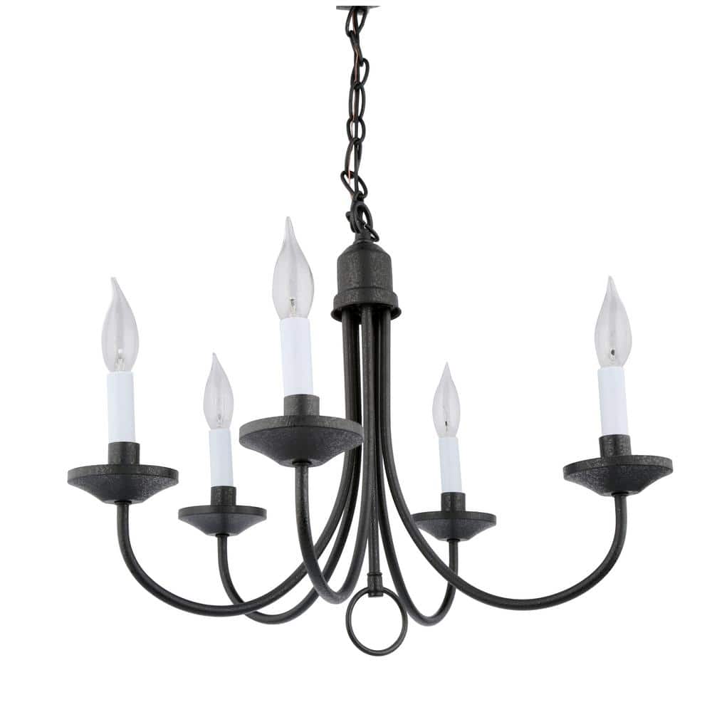 Bring traditional elegance to your home with the Progress Lighting Five-Light Black Chandelier. Its timeless candle design enhances classic interiors with ambient lighting suitable for dining rooms, foyers, and living areas. Crafted with a durable black textured metal finish and graceful white candle sleeves, it provides a sophisticated touch to any setting.