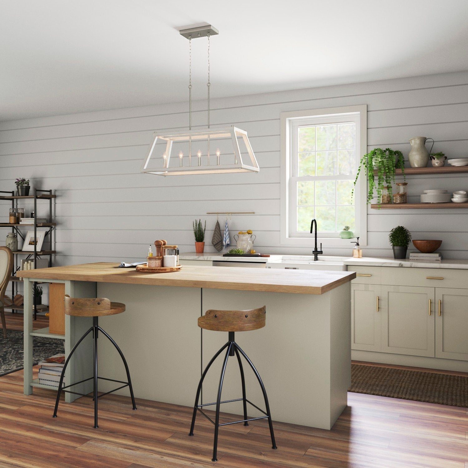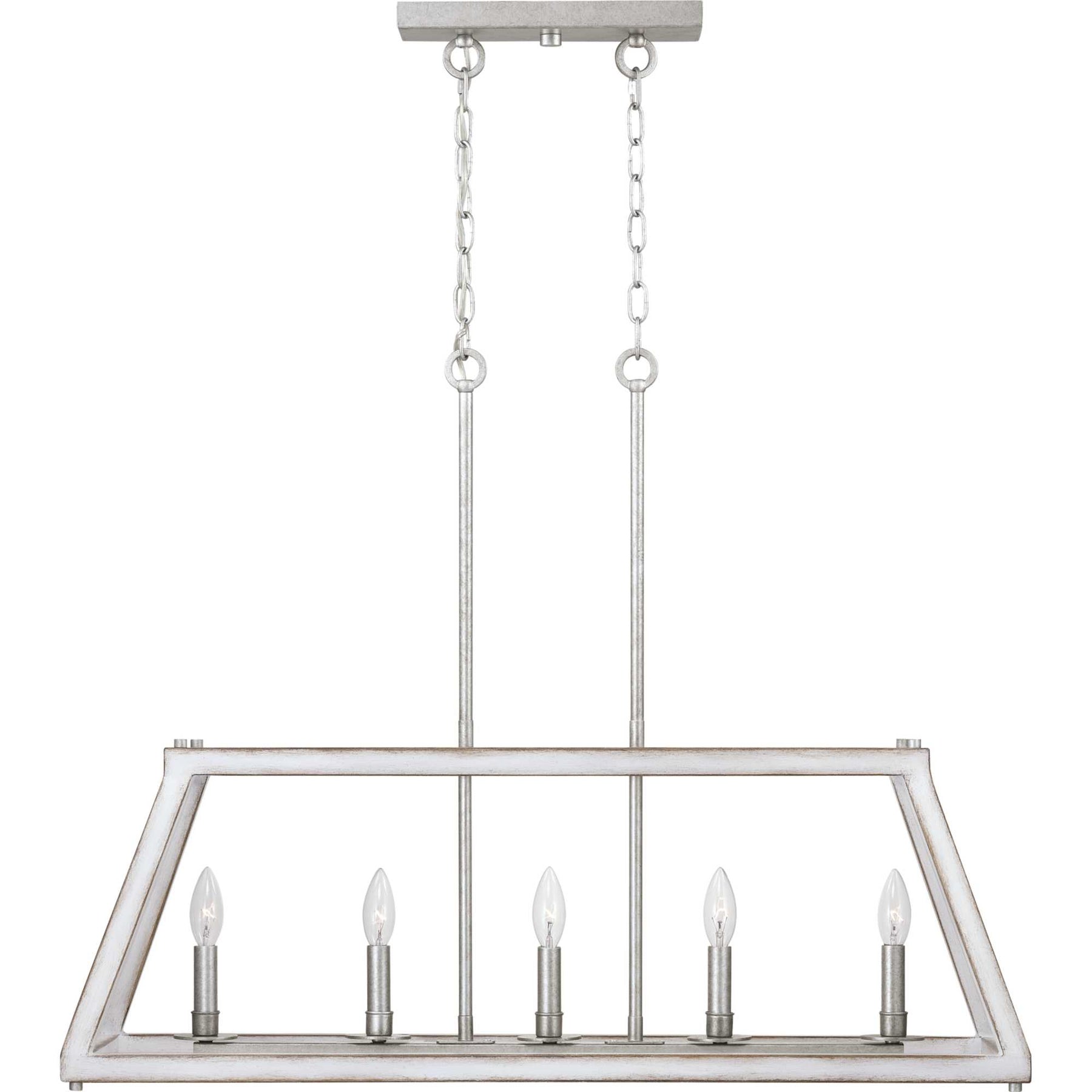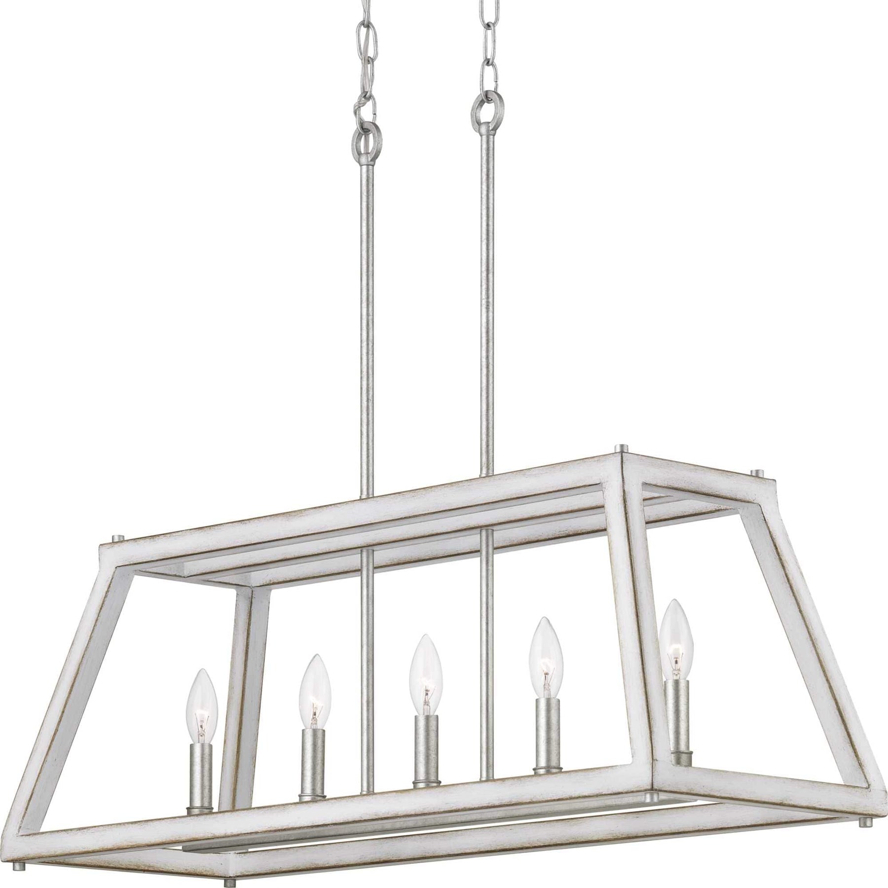 Imagine the transformative power of the Forrester 5-Light Gray Farmhouse Chandelier, with its enchantingly rustic allure enhanced by an antique white and galvanized finish. This centerpiece breathes new life into any room, casting warm, ambient light through its geometric open frame. Infuse your dining space with character by pairing this chandelier with vintage furniture and natural wood elements, creating a harmonious balance of rugged elegance. A testament to timeless design, this chandelier is essential for those seeking to craft a rich and welcoming environment.