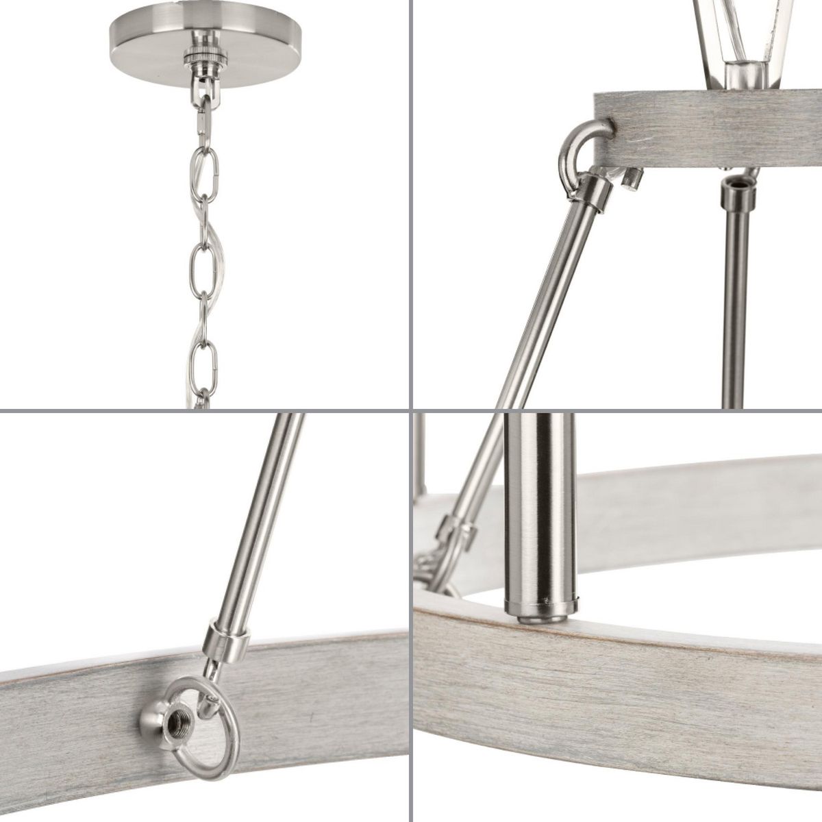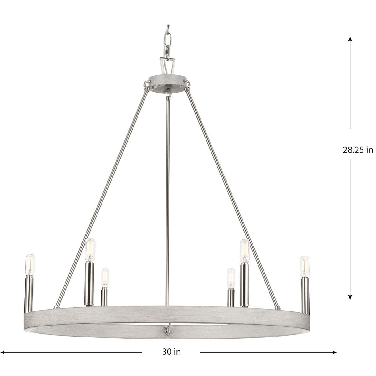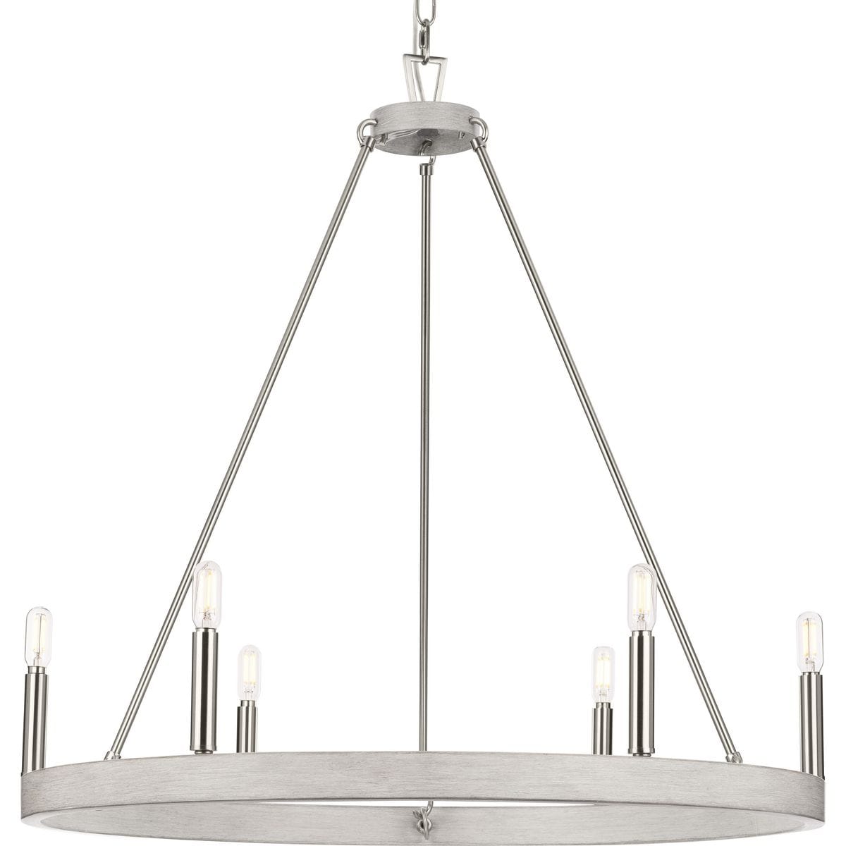 Illuminate your space with the exquisitely designed Galloway 6-Light Farmhouse Chandelier by Progress Lighting. This striking piece combines modern aesthetics with rustic charm, featuring brushed nickel candle holders and grey washed oak accents. Perfect for adding a sophisticated touch to dining rooms, great rooms, and bedrooms.