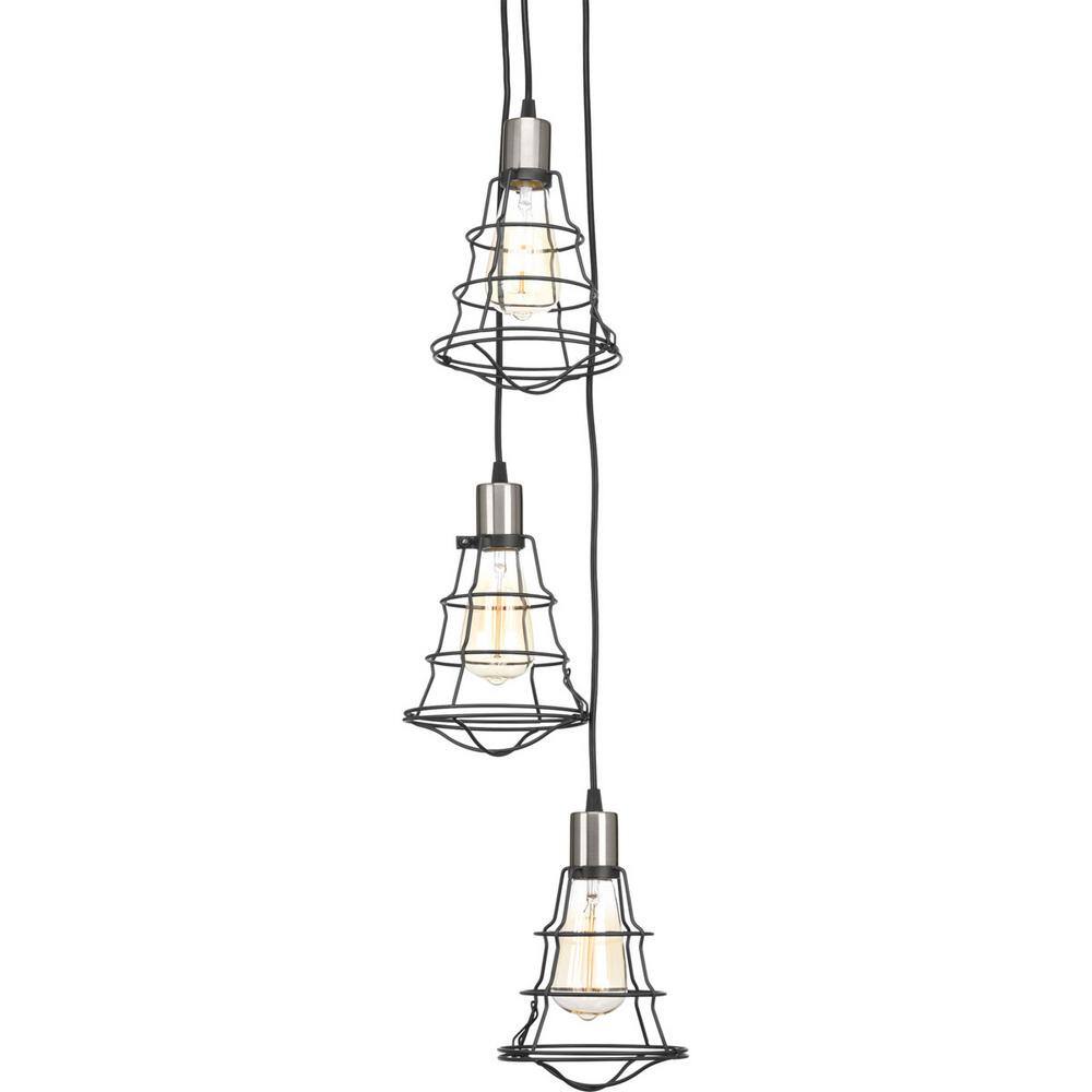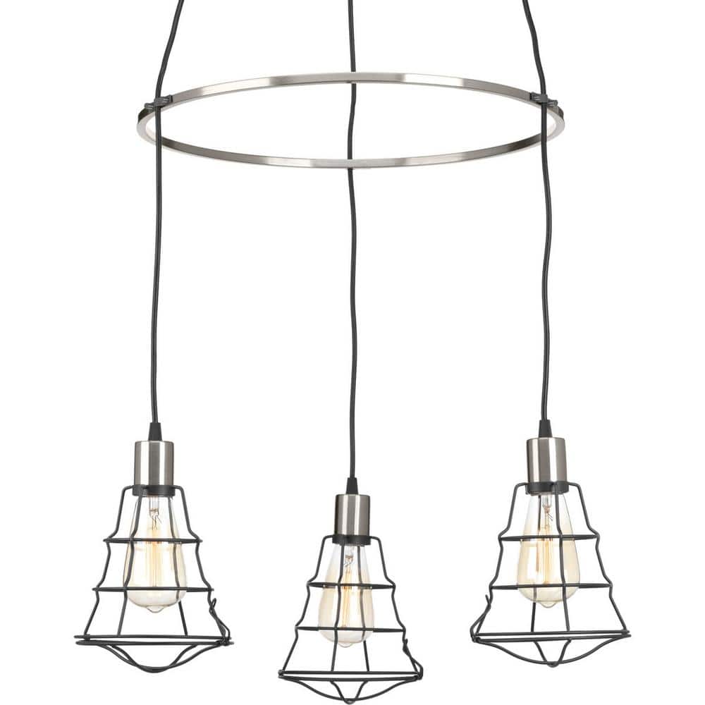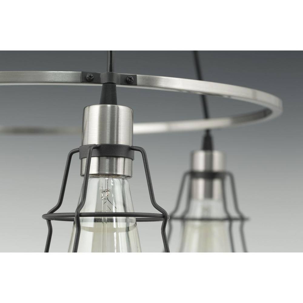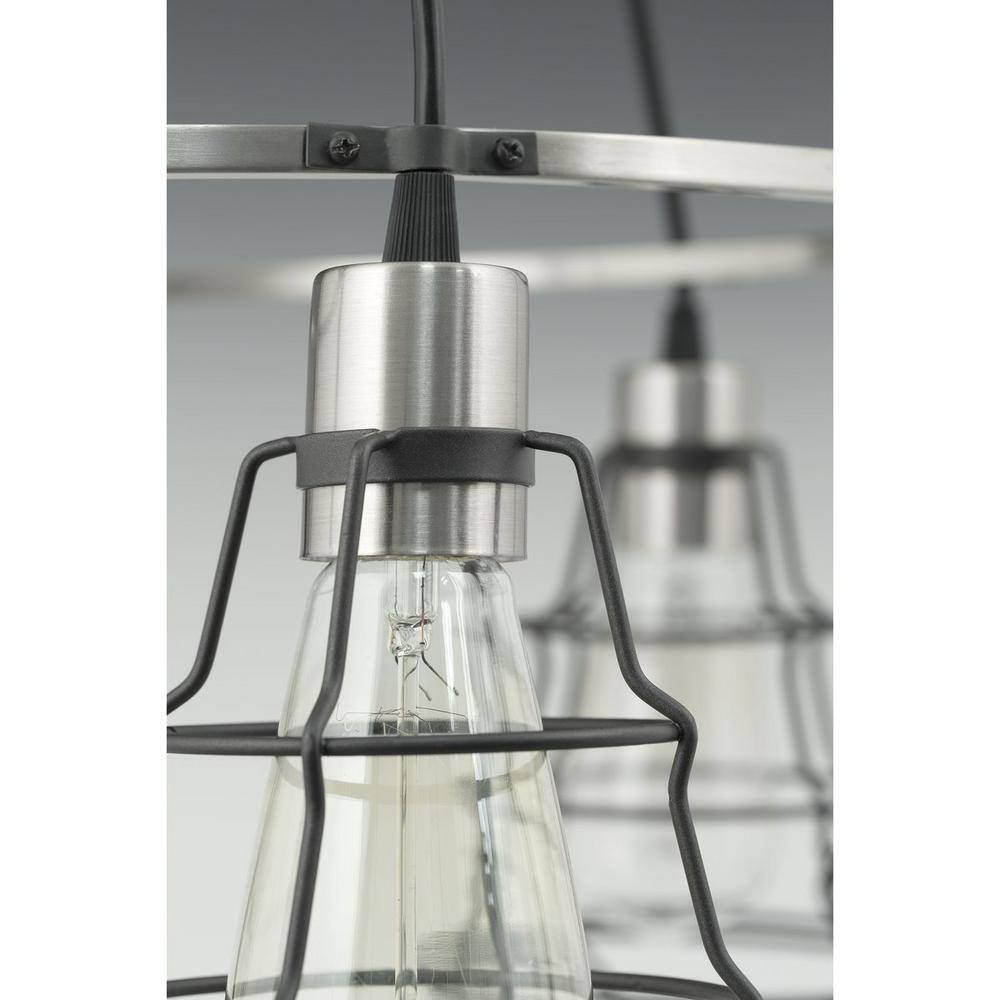 Illuminate your space with industrial elegance using the Gauge Collection 3-Light Graphite Chandelier by Progress Lighting. Featuring a cutting-edge open cage design with a sleek graphite finish and brushed nickel accents, this pendant light offers both aesthetic appeal and customization flexibility in any room.