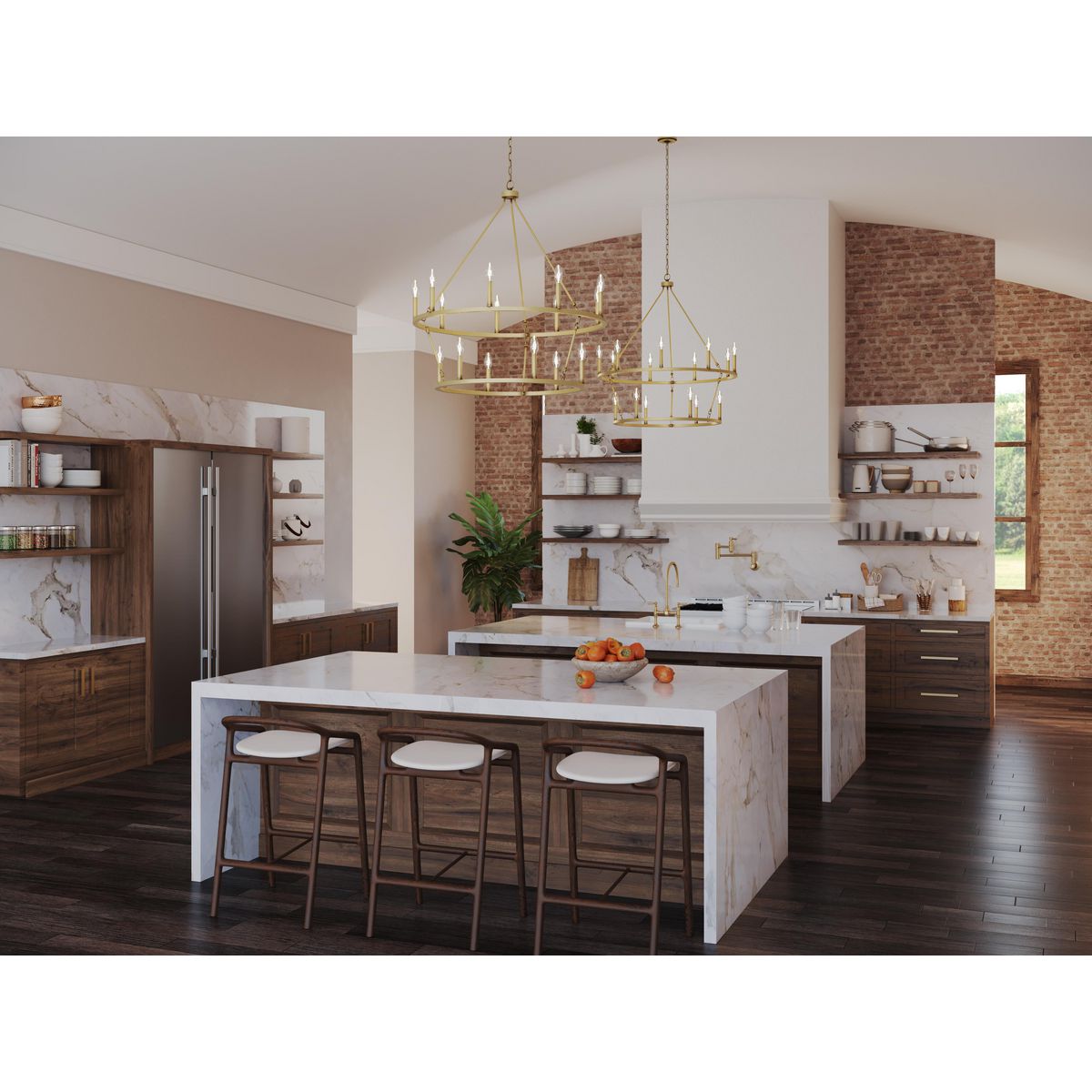 The Gilliam 15-Light Farmhouse Chandelier transforms any room into a sanctuary of light and luxury. Its exquisite vintage brass finish and airy, circular design evoke a sense of timeless elegance, casting a warm and inviting glow. Imagine this chandelier as the centerpiece of a grand dining room or the focal point of an elegant foyer. Its dual-tier structure encapsulates opulence, making it an indispensable piece for those who treasure sophisticated, modern farmhouse charm.