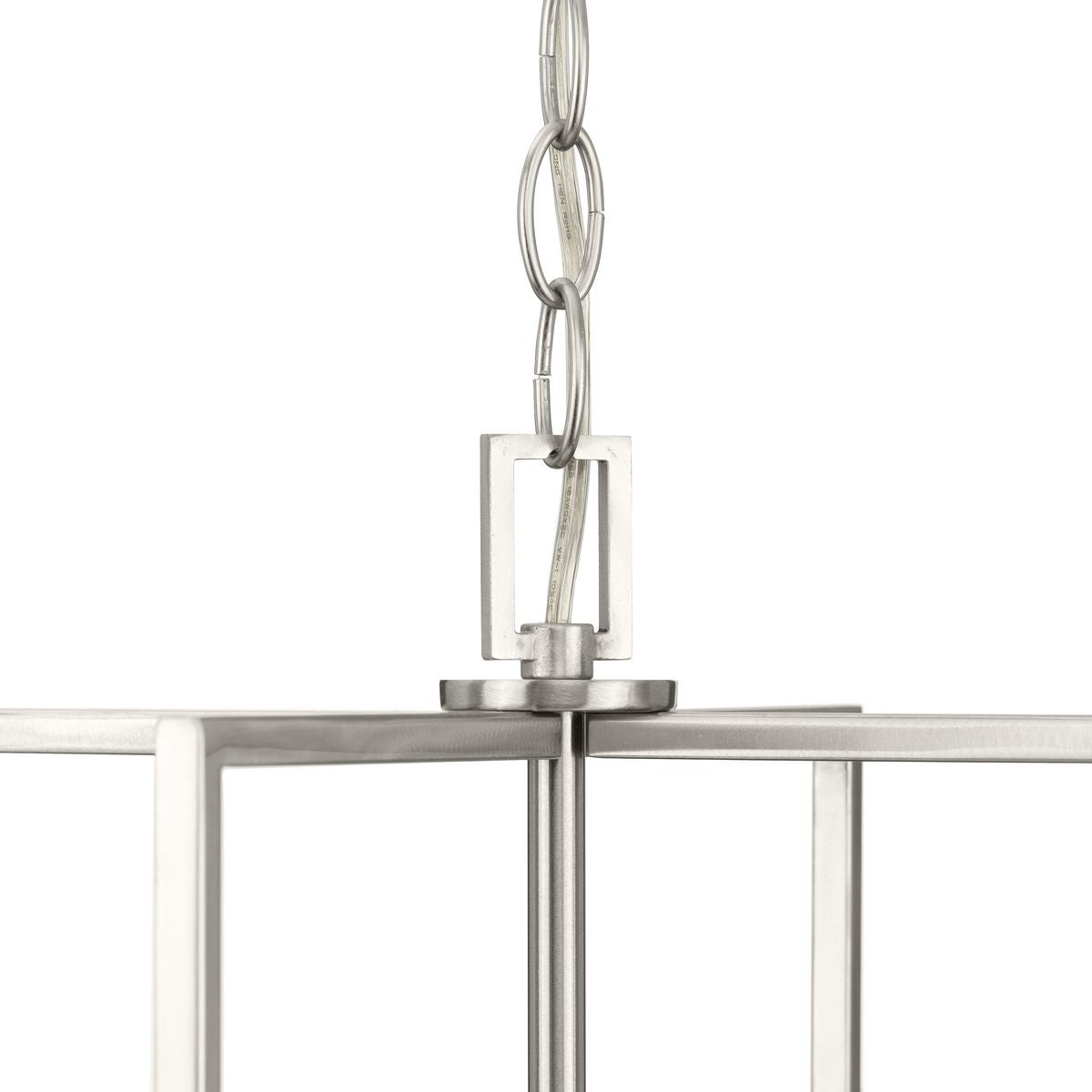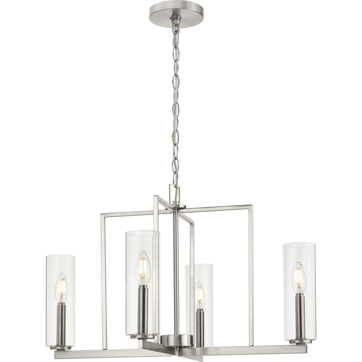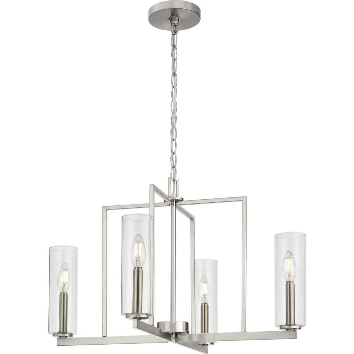 The Progress Lighting Glennaire 4-Light Chandelier features a modern, sophisticated design with a brushed nickel finish and clear glass shades, perfect for illuminating dining rooms and kitchens. Its adjustable hanging height allows versatile placement, while its sleek silhouette complements contemporary interiors beautifully.