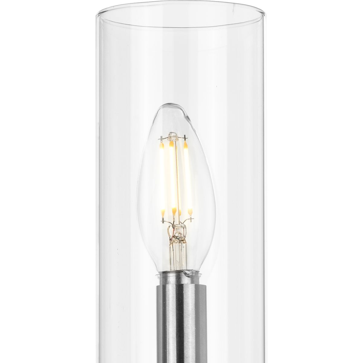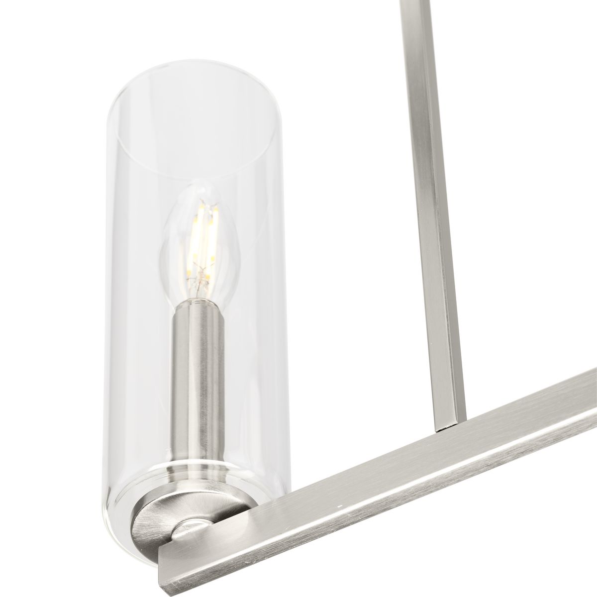 • Finish: Features a brushed nickel finish with clear glass shades for a sleek, modern look.