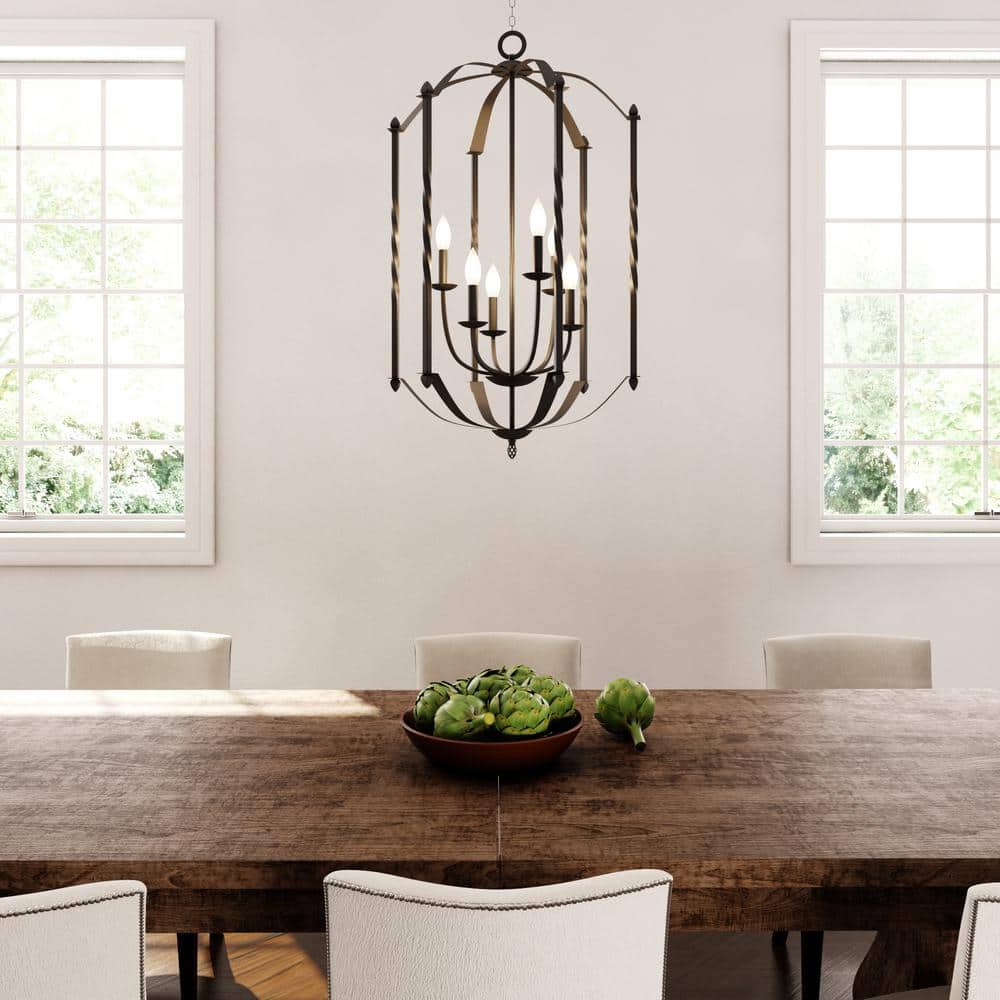 The Greyson Collection 6-Light Black Chandelier by Progress Lighting blends rustic charm with modern aesthetics, featuring a robust black iron frame and elegant candle-style fixtures. Perfect for any living space, this chandelier offers a touch of sophistication and versatility with its bold yet casual design.