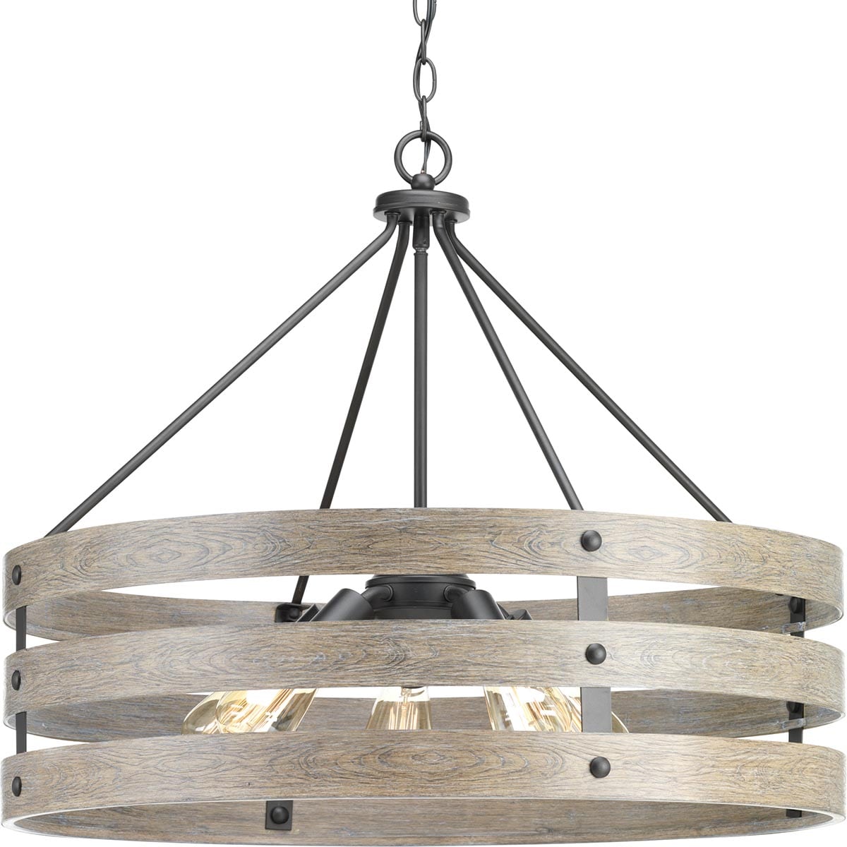 Illuminate your space with the Gulliver 5-Light Graphite Farmhouse Pendant. This captivating drum-shaped fixture, with its dual-toned graphite and weathered gray finish, combines rustic charm with modern elegance. Perfect for dining rooms, living areas, or foyers, it's a stylish centerpiece for any farmhouse or industrial-themed interior.