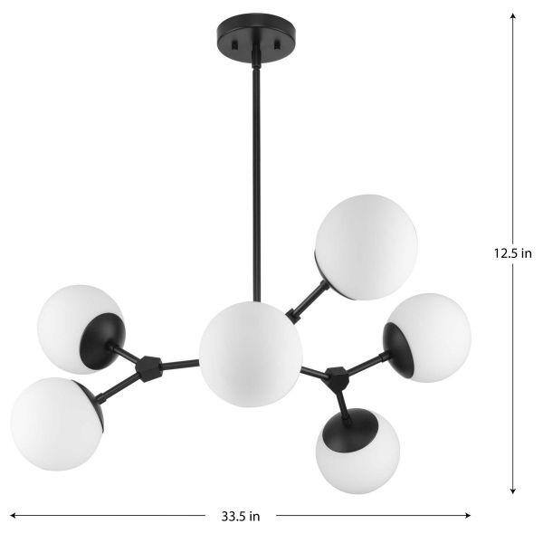 The Haas 33.5" 6-Light Chandelier from Progress Lighting infuses modern elegance into any space. With a sleek matte black finish and opal glass globes, this fixture seamlessly blends mid-century modern charm with contemporary appeal, ideal for dining rooms, kitchens, or living areas.