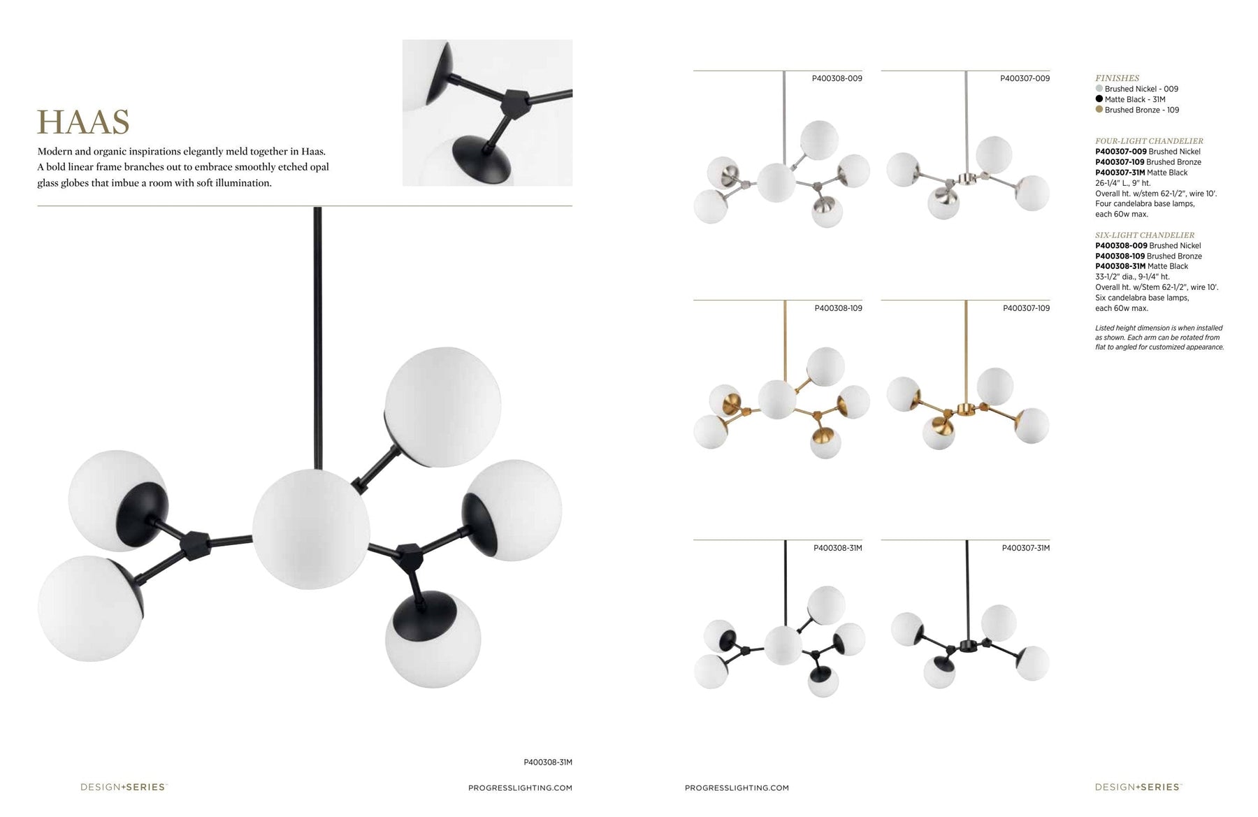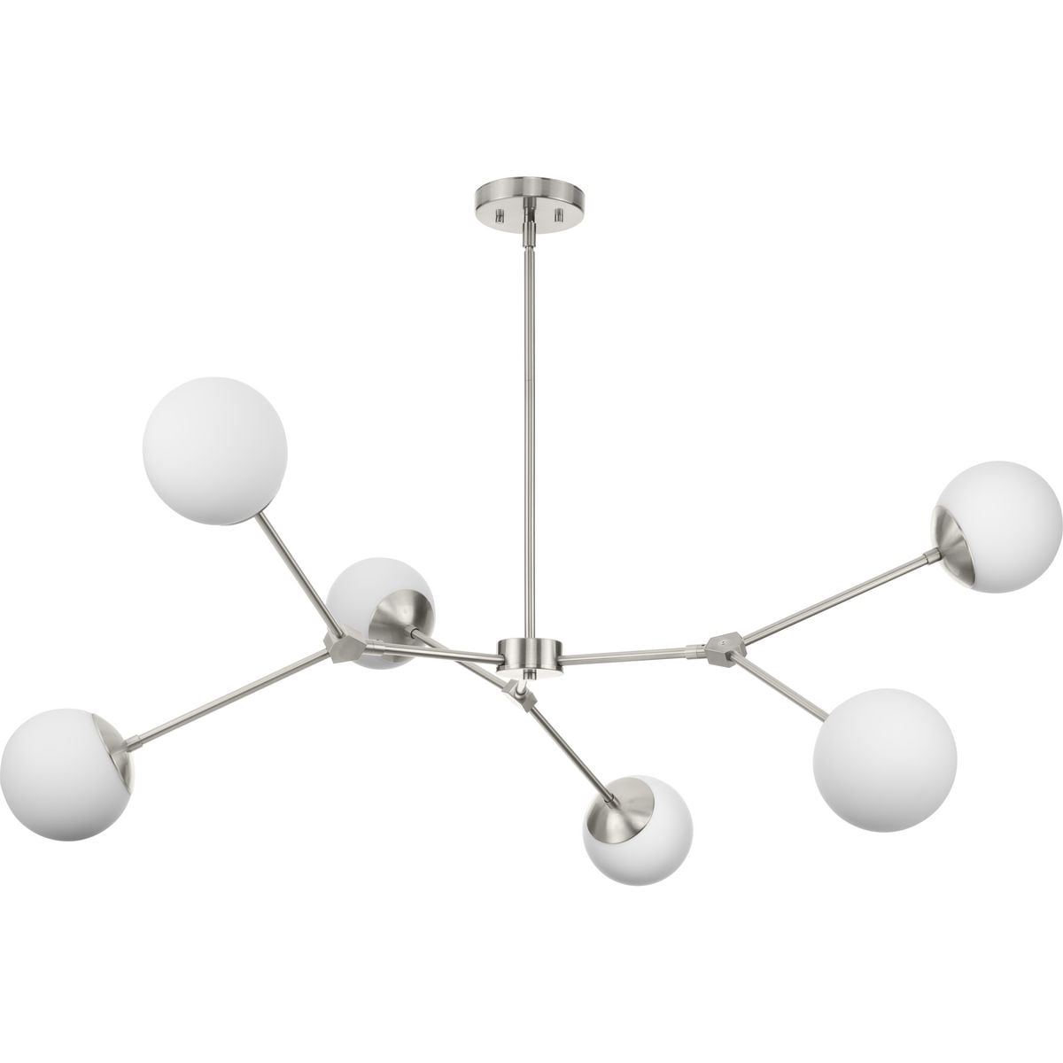 The Haas 6-Light Mid-century Chandelier by Progress Lighting seamlessly blends modern elegance with a retro flair. Its brushed nickel finish and etched opal glass globes create an inviting ambiance, perfect for dining rooms, great rooms, and bedrooms. Designed with adjustable arms and includes extension rods for versatile placement, it offers both style and functionality.