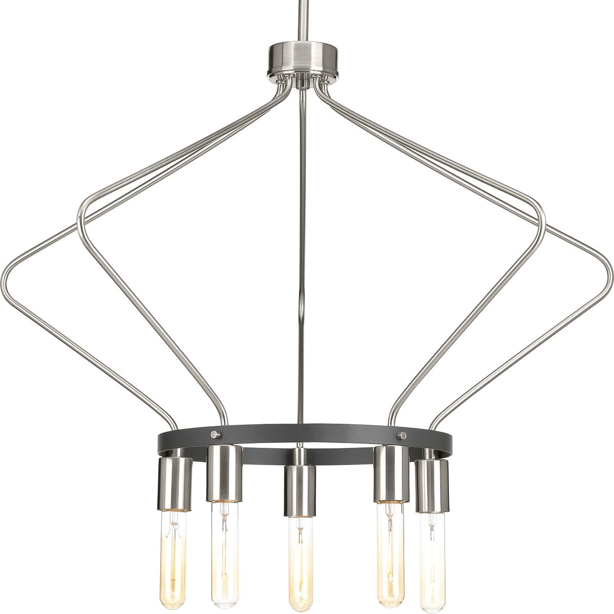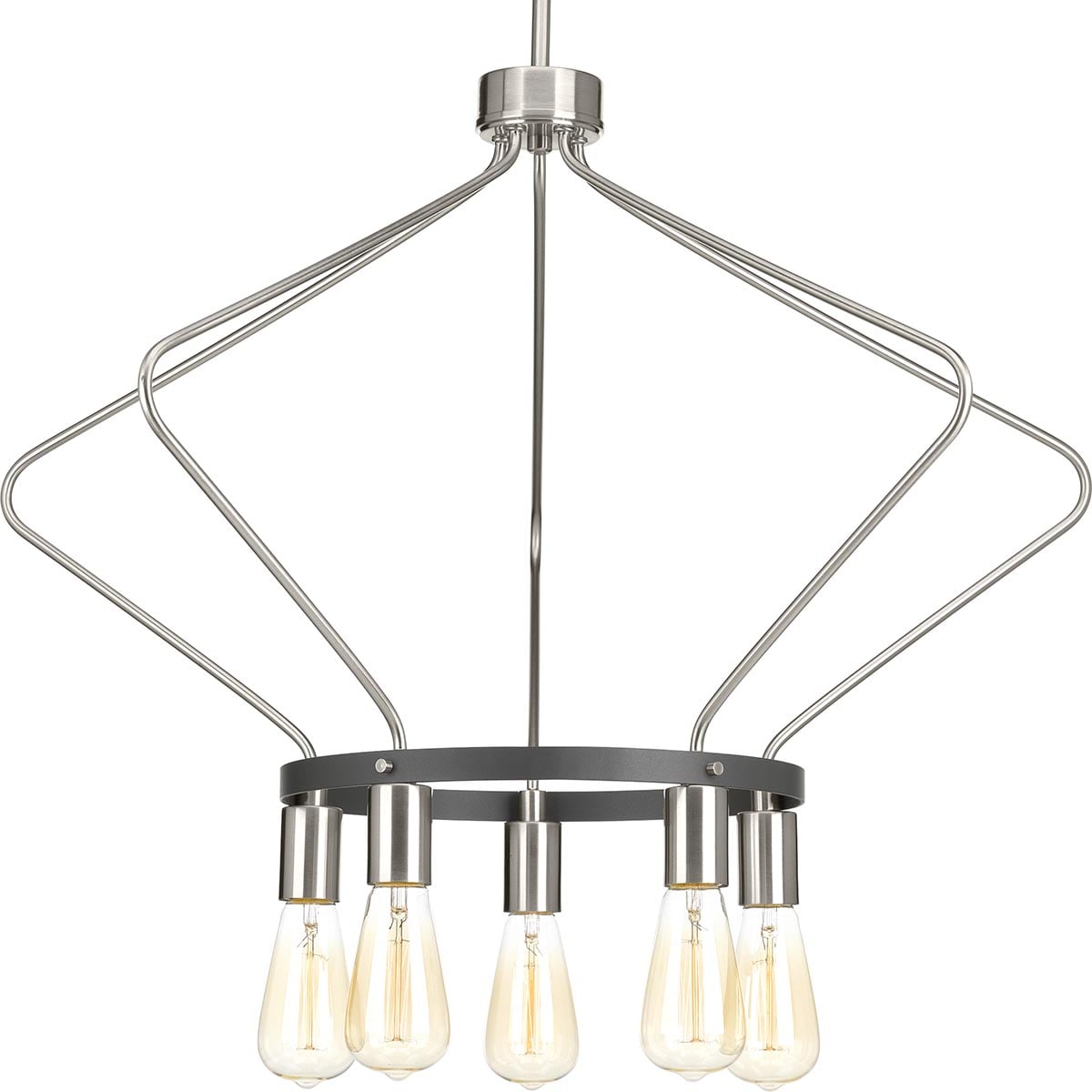 The Progress Lighting Hangar 5-Light Chandelier brings an industrial elegance to your home with its brushed nickel finish and modern wire basket design. Perfect for styling in dining rooms, foyers, or great rooms, it seamlessly blends farmhouse and urban industrial aesthetics. This striking fixture is customizable to various ceiling heights and accommodates five medium base bulbs.