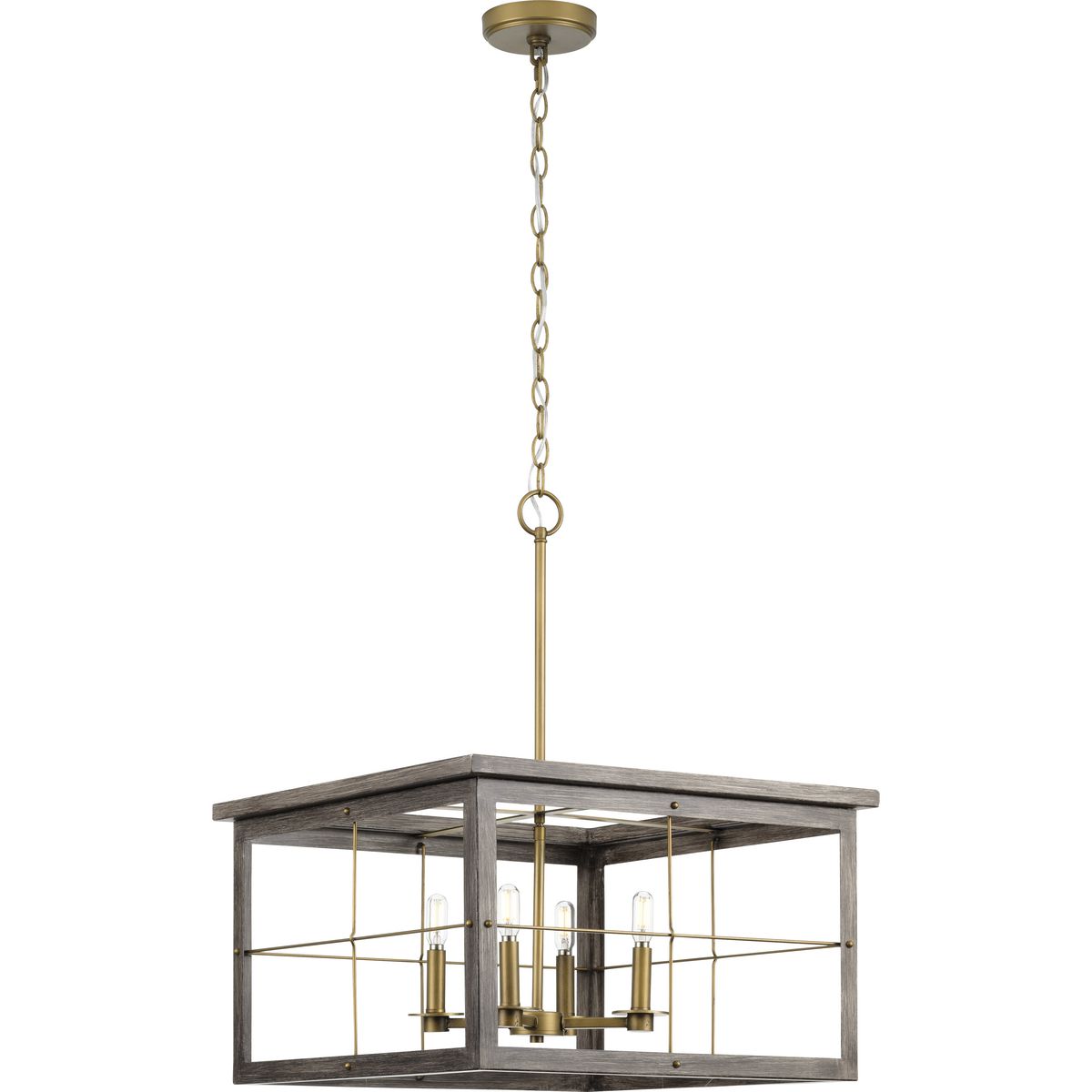 Illuminate your space with the Hedgerow 4-Light Coastal Chandelier, seamlessly blending farmhouse charm with urban sophistication. Crafted with a distressed faux wood frame and accented with burnished brass, this fixture provides a captivating glow for any dining room, kitchen, bedroom, or living room.