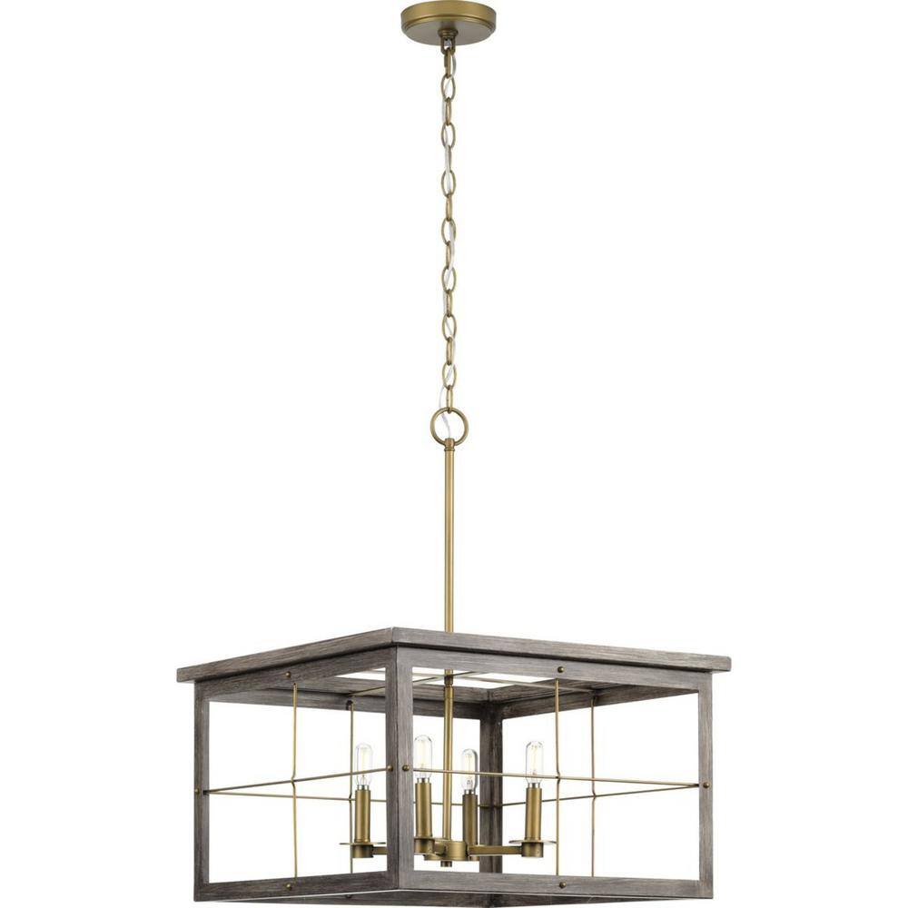 Elevate your space with the Hedgerow Collection 4-Light Farmhouse Chandelier by Progress Lighting. This piece blends rustic charm with a modern twist, featuring an aged oak faux wood frame and distressed brass accents. Ideal for dining rooms or living rooms, it offers a versatile, timeless appeal.