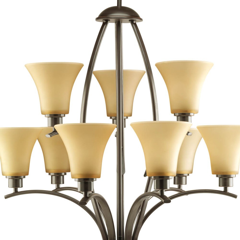 Illuminate your home with the elegant charm of the Progress Lighting Joy 9-Light Chandelier. Designed in a sophisticated antique bronze finish, this traditional fixture features two tiers of gracefully arched metal arms paired with etched light umber glass shades, offering a beautiful focal point for dining rooms or living spaces. Its adjustable length and compatibility with various bulb types ensure both versatility and style.