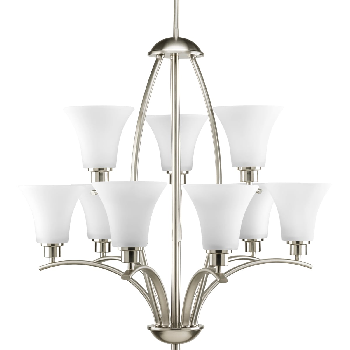 Illuminate your home with the radiant gleam of the Joy 9-Light Brushed Nickel Chandelier. This exquisite piece interweaves gleaming arcs of metal with gently etched white glass shades, creating a luminous focal point that delights and enchants. Imagine it suspended elegantly above a grand dining table or gracing a lofty foyer with its two-tier charm. This chandelier does more than light up a room; it crafts an ambiance of pure luxury and timeless style, making it an essential fixture for sophisticated living.