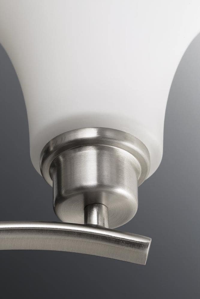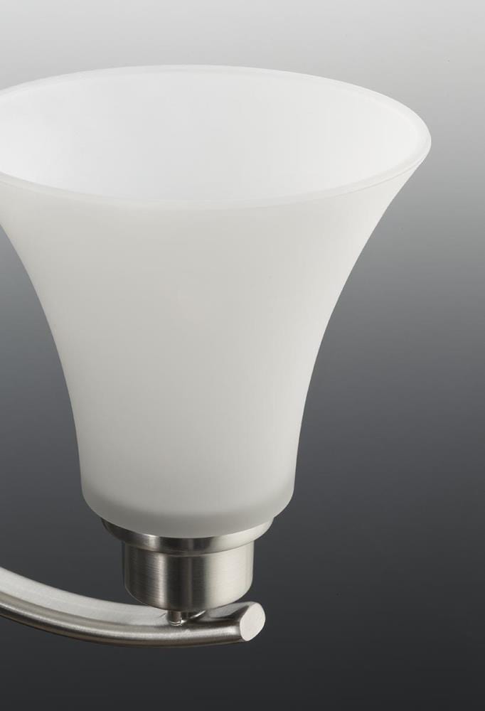 Elegant Design: Features etched white glass shades paired with the smooth, classic look of a brushed nickel finish.