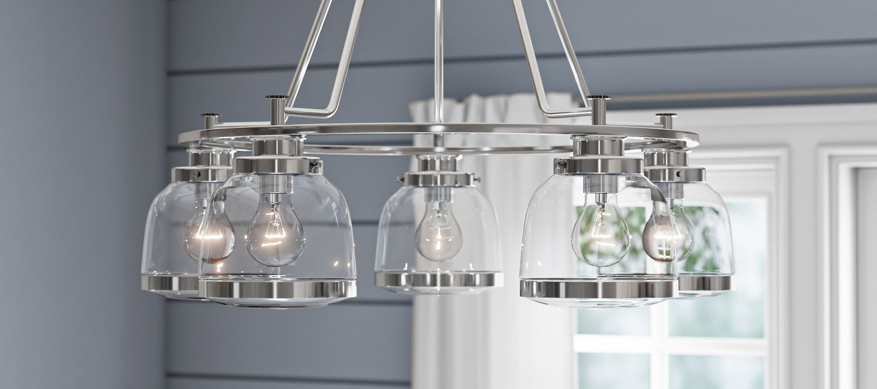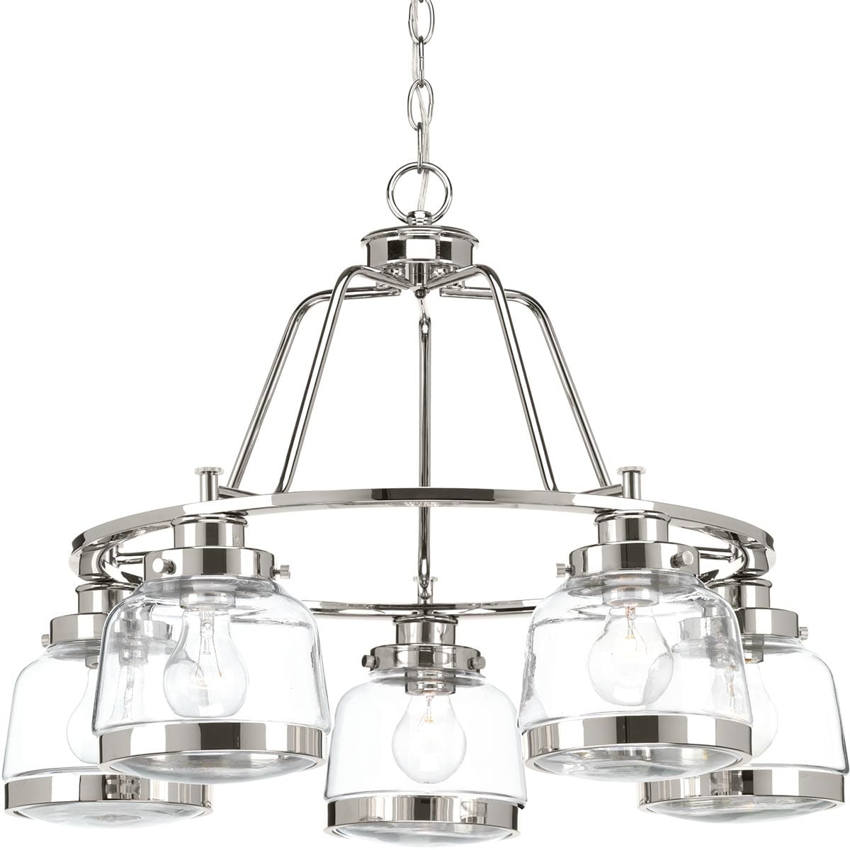 Illuminate your space with the elegant charm of the Judson 5-Light Chandelier by Progress Lighting. This sophisticated fixture is designed in polished nickel with clear schoolhouse-style globes, perfectly complementing farmhouse or coastal-inspired interiors. Transform your dining or living area with its timeless appeal and customizable height options for a perfect fit.