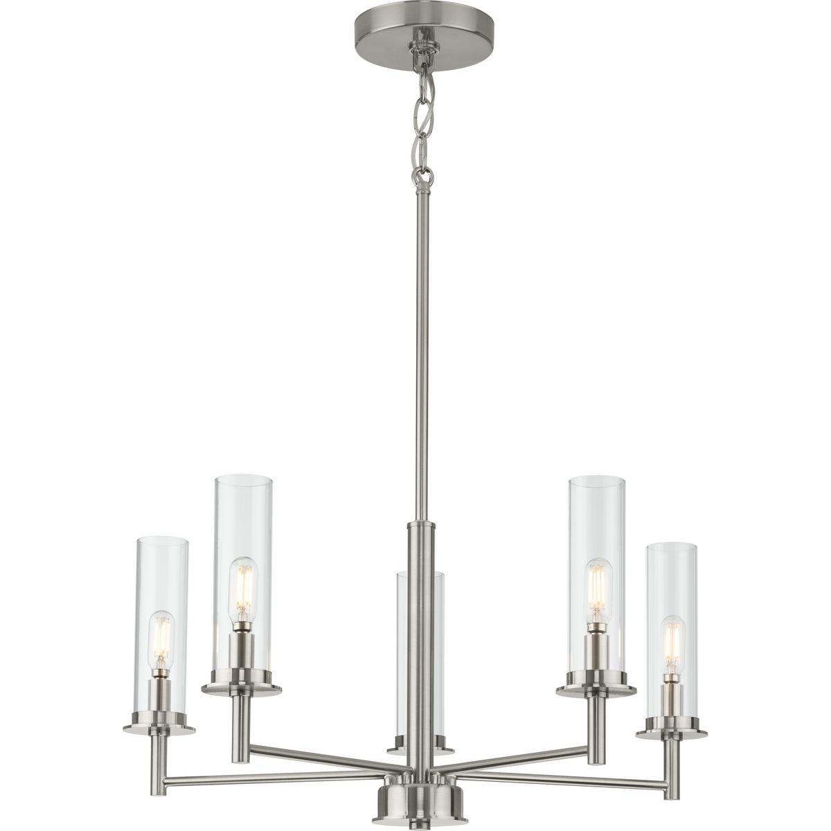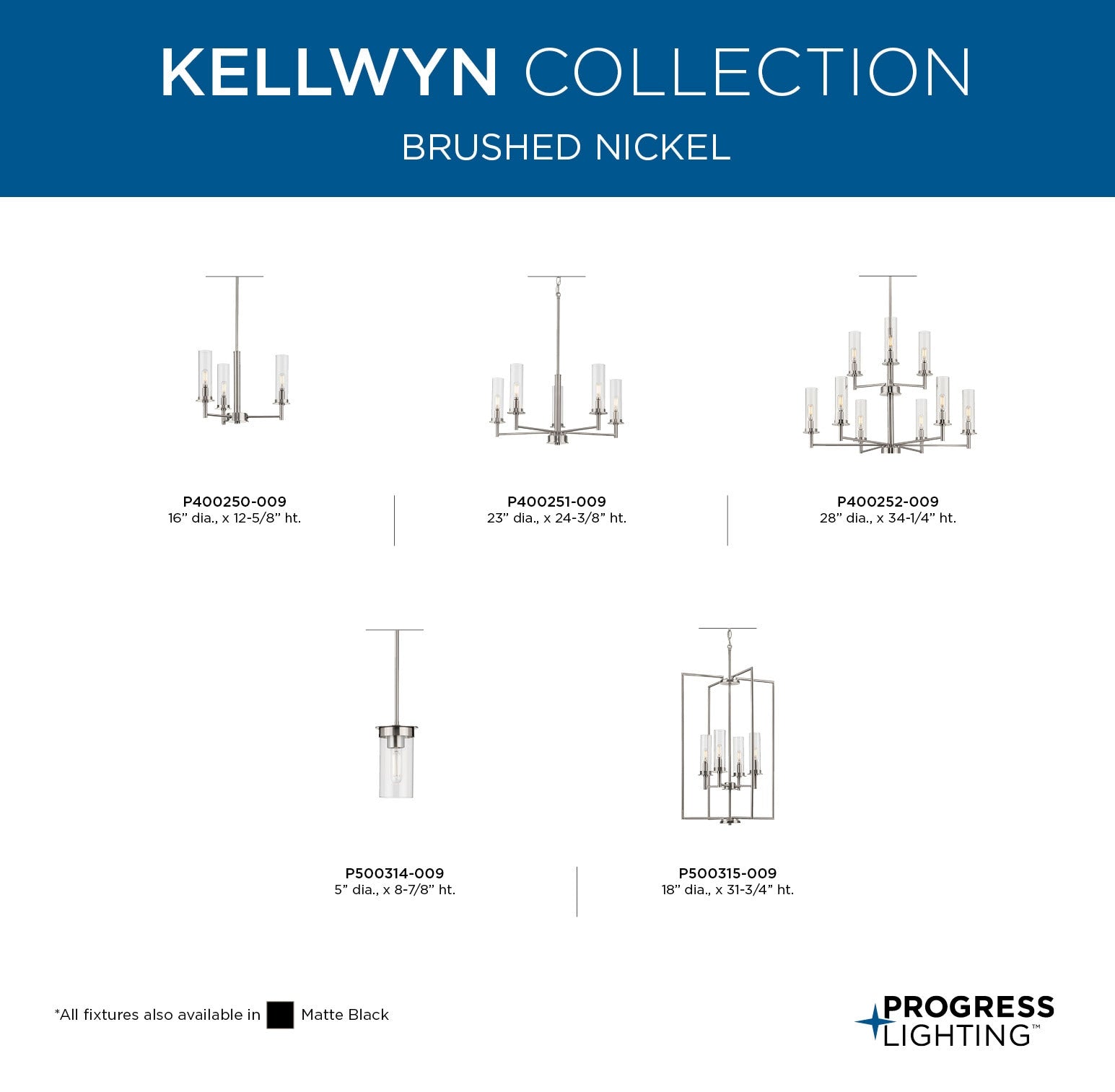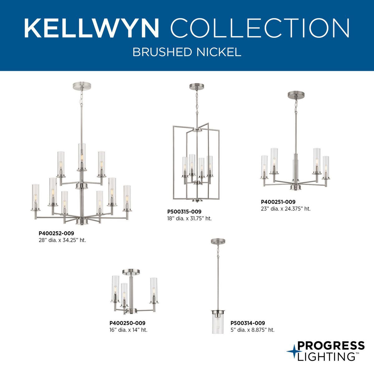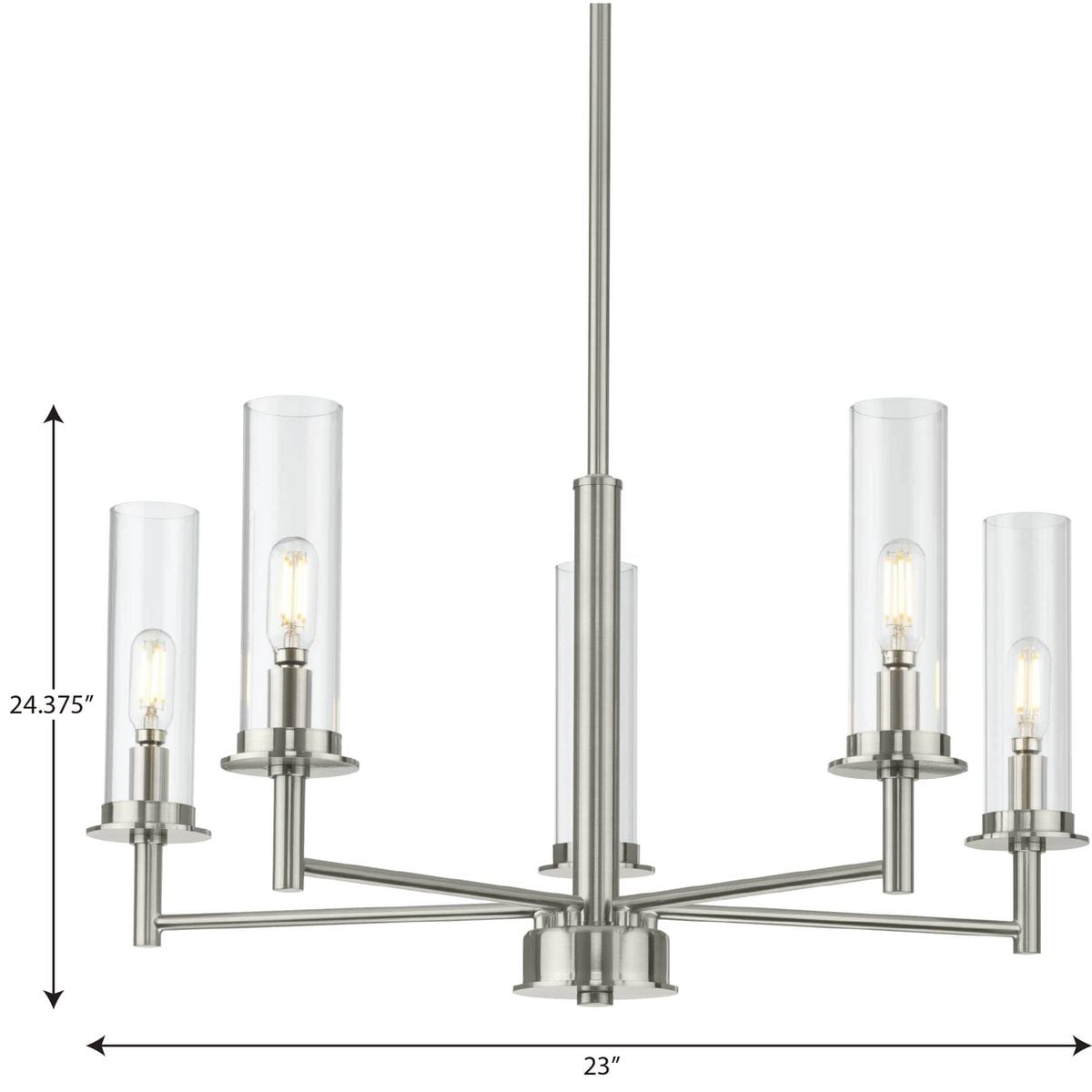Illuminate your space with the elegant Kellwyn 5-Light Chandelier from Progress Lighting, featuring a blend of traditional and modern aesthetics. The brushed nickel frame exudes sophistication, while the clear glass shades add a touch of luxury. Crafted from durable steel, this chandelier ensures lasting beauty in any indoor environment.