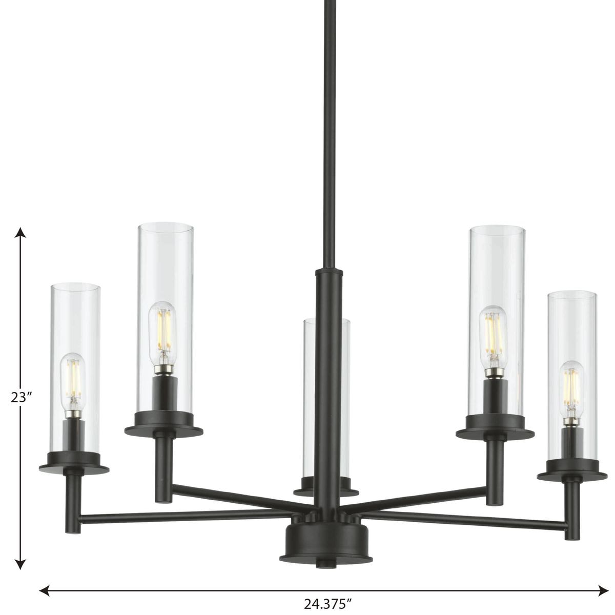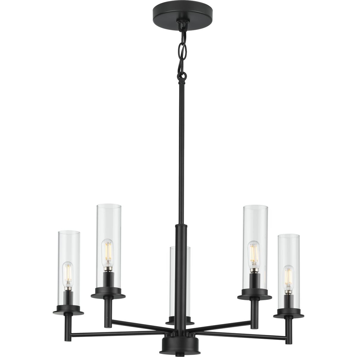 Elevate any room's ambiance with the Kellwyn 5-Light Matte Black Chandelier from Progress Lighting. This fixture blends modern elegance with traditional charm, featuring a classic frame and luxurious cylindrical glass shades. Ideal for transitional spaces, this chandelier provides both high-quality illumination and lasting style.