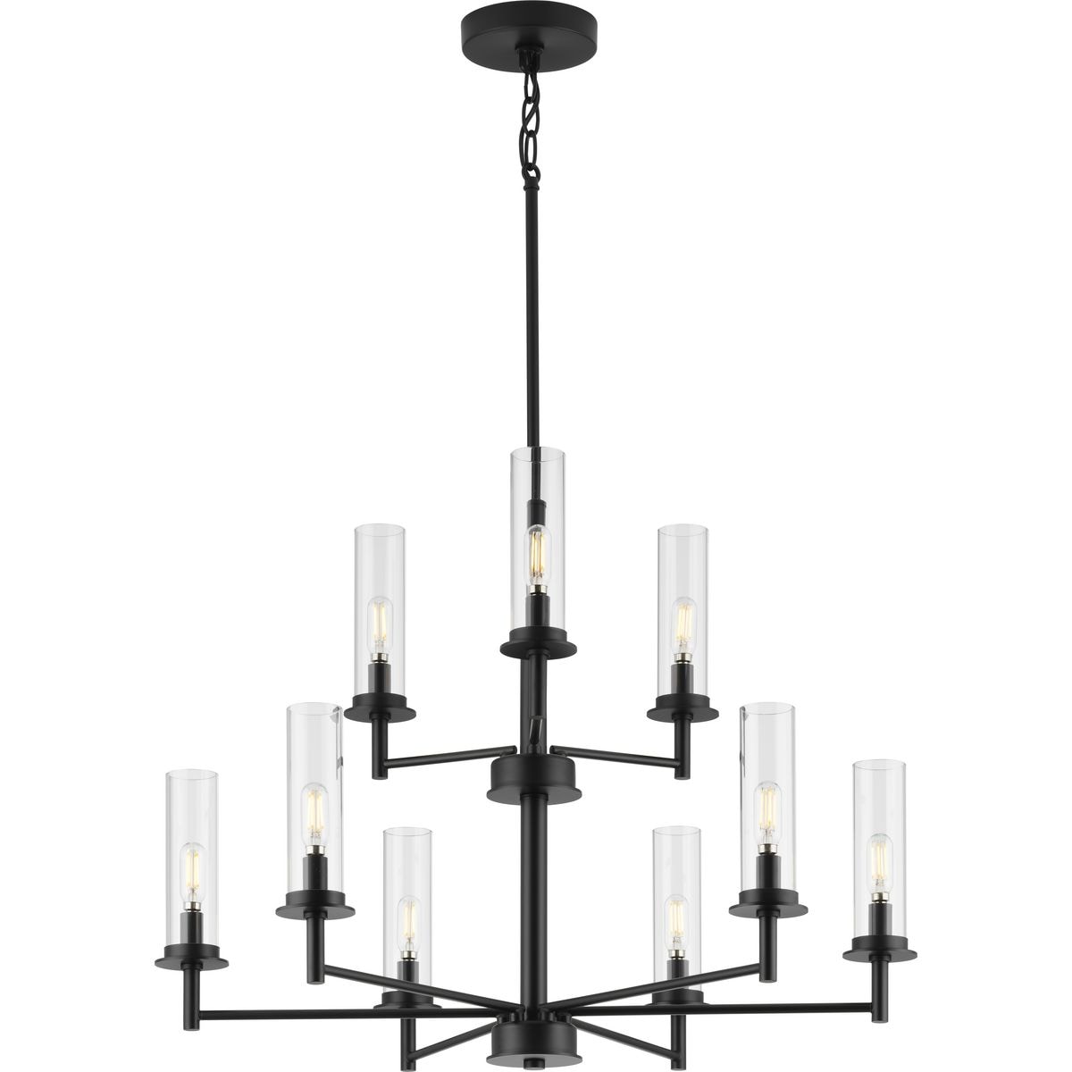 Illuminate your home with the stunning Kellwyn 9-Light Matte Black Chandelier from Progress Lighting, expertly balancing traditional and modern design elements. Its matte black frame, coupled with luxurious clear glass shades, creates a sophisticated statement piece perfect for dining rooms, kitchens, and living rooms.