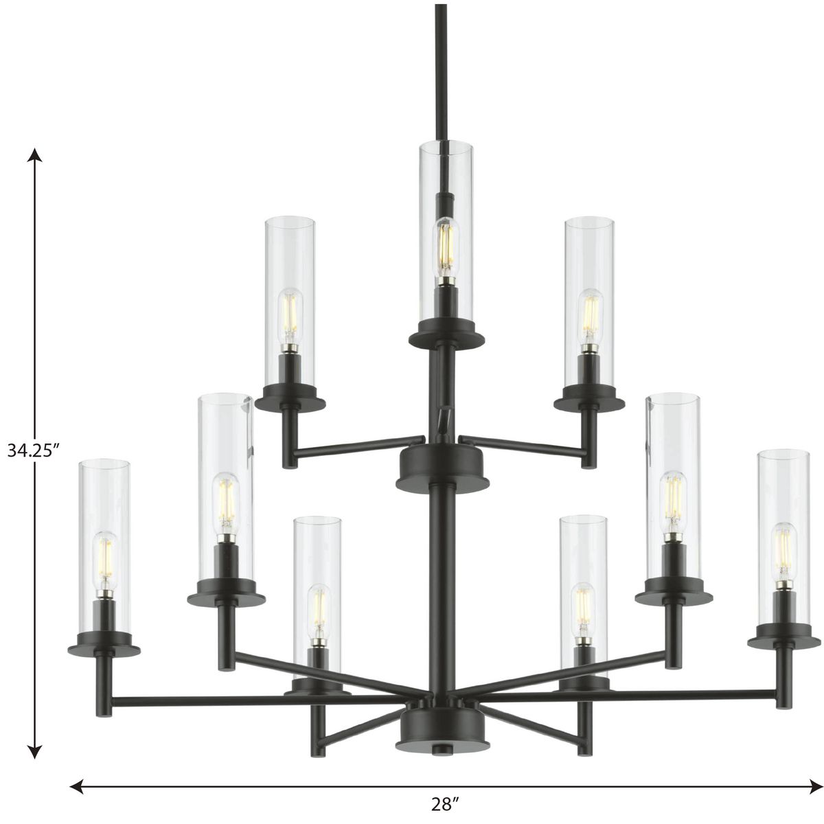 Introducing the Kellwyn Chandelier—a masterpiece that captivates with its elegant dual-tier frame and radiant glow peeking through clear cylindrical glass. This fixture becomes the crown jewel of a room, transforming mundane interiors into sophisticated settings. Imagine it above a sumptuous dining table or gracing a grand entryway, casting light and luxury in equal measure. A quintessential piece that elevates any decor, reinforcing the narrative of exquisite, opulent living.