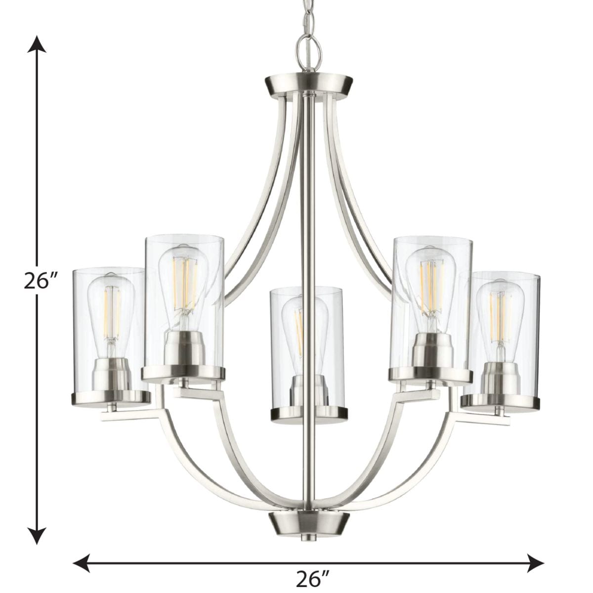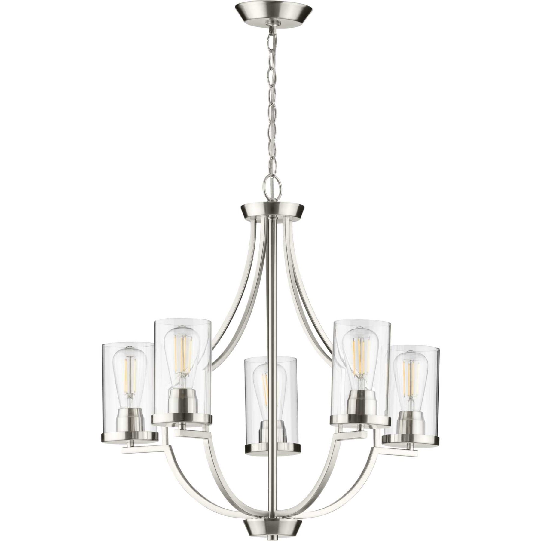 Illuminate your home with the Lassiter 5-Light Brushed Nickel Chandelier, a versatile lighting solution that marries modern and traditional aesthetics. Its brushed nickel finish and clear glass shades create a timeless elegance perfect for any room. This chandelier is as functional as it is beautiful, with adjustable features and compatibility with various bulb types.