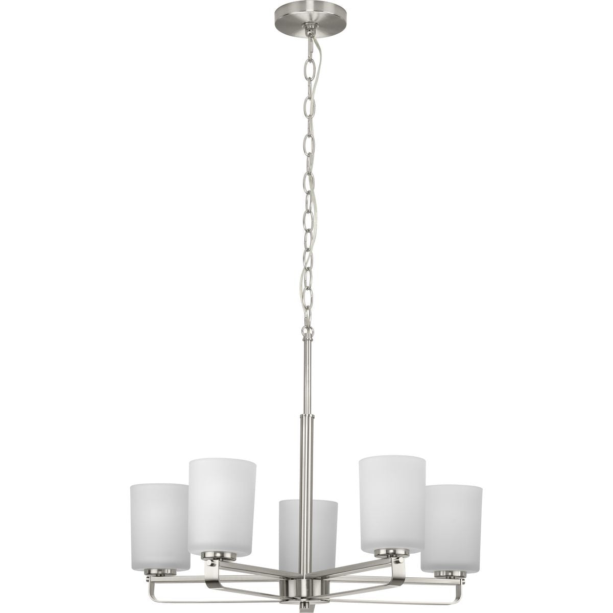 Elevate your home's interior design with the Progress Lighting League 5-Light Brushed Nickel Chandelier. This modern farmhouse light fixture combines elegance and durability, featuring a steel frame in a brushed nickel finish and classic etched glass shades. Its versatile design enriches any dining room, kitchen, foyer, or living room setting.