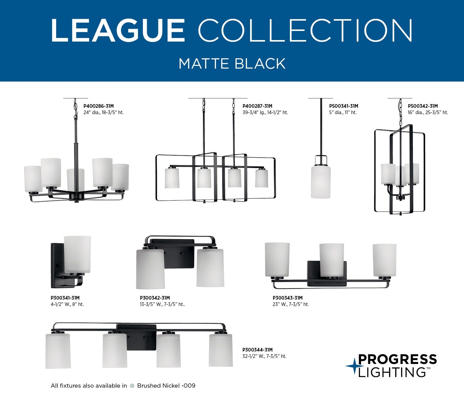 The Progress Lighting League 5-Light Matte Black Farmhouse Chandelier is a dazzling addition to any contemporary space. With its sleek matte black finish and classic etched glass shades, this fixture delivers a fusion of modern design and farmhouse elegance. Perfect for illuminating dining areas, kitchens, and foyers, it combines style with durable steel construction for long-lasting allure.