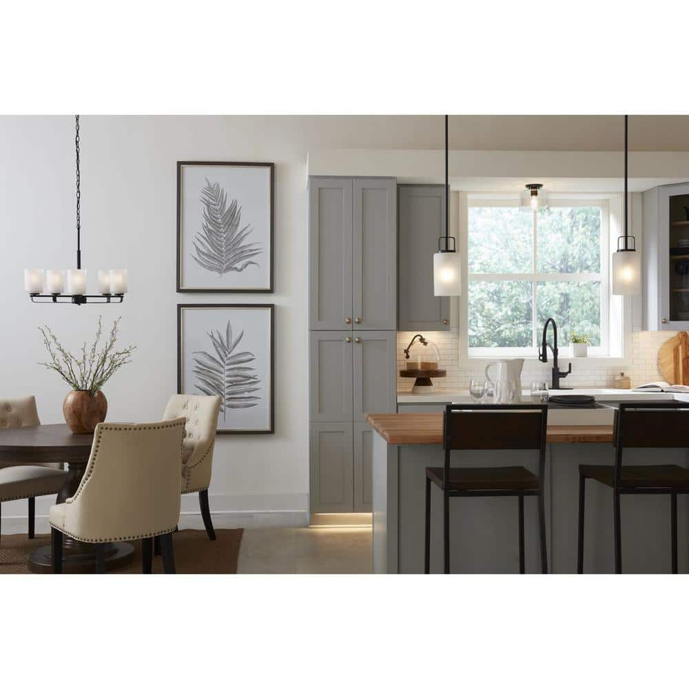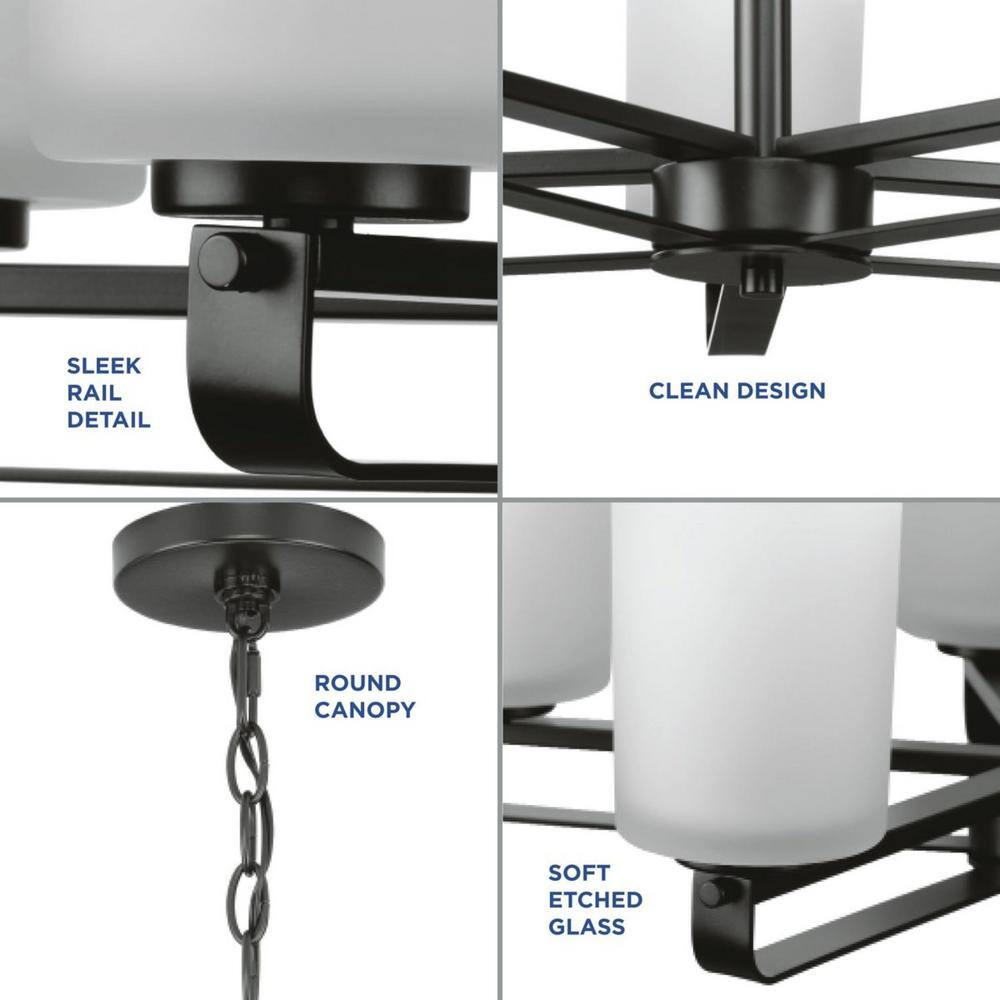 Elevate your living space with the League Collection 5-Light Matte Black Etched Glass Chandelier by Progress Lighting. Its sleek frame and gracefully extended arms bring a refined modern aesthetic to any room while ensuring quality and durability with its sturdy steel construction. Ideal for dining rooms, kitchens, or foyers, this contemporary chandelier elevates style and ambiance with classic sophistication.