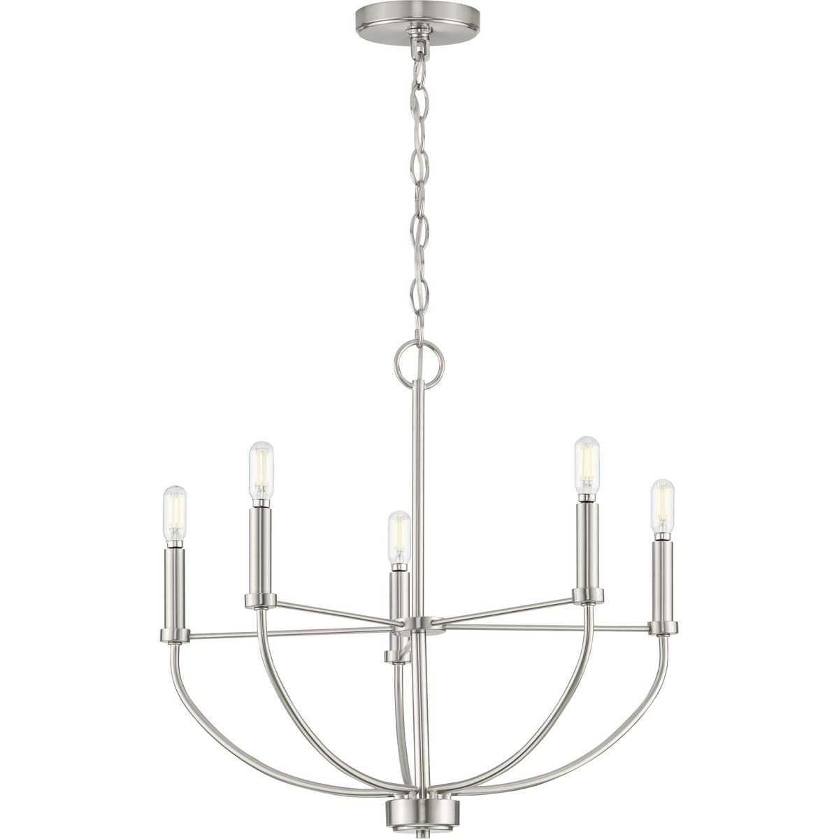 The Leyden 5-Light Chandelier by Progress Lighting casts a dazzling glow that dramatically transforms any room into a luxurious haven. Its brushed nickel finishes and gracefully arched arms create an opulent focal point evocative of vintage candlesticks. Style this chandelier above a grand dining table or in an elegant foyer paired with modern furniture for a striking juxtaposition. This piece is an essential adornment, infusing spaces with an aura of sophisticated charm and timeless allure.