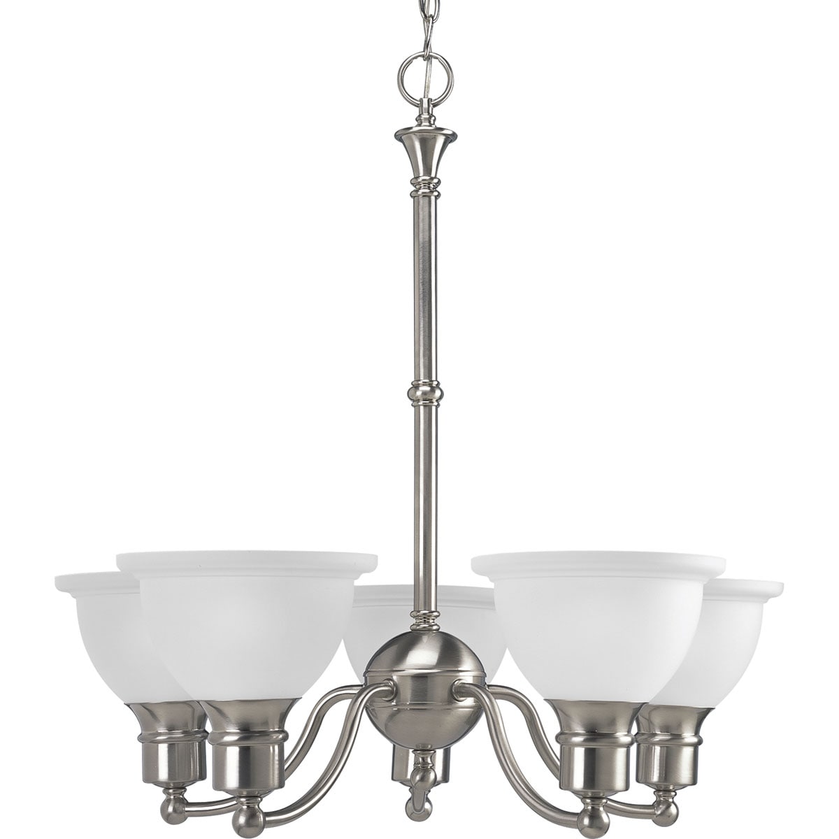 Illuminate your space with the timeless elegance of the Madison 5-Light Brushed Nickel Chandelier. This fixture features delicately etched glass shades and a stunning brushed nickel finish, ideal for transitional or traditional settings. Perfectly suited for a dining room, kitchen, or living area, it adds sophistication and ambiance to any interior.