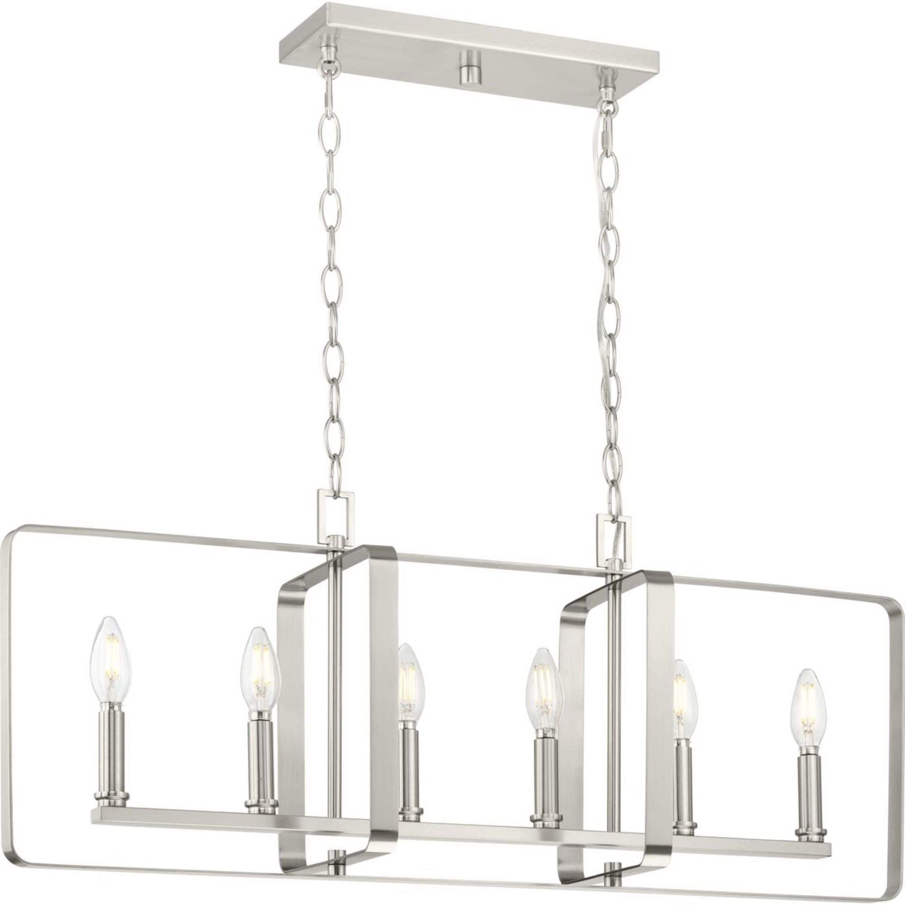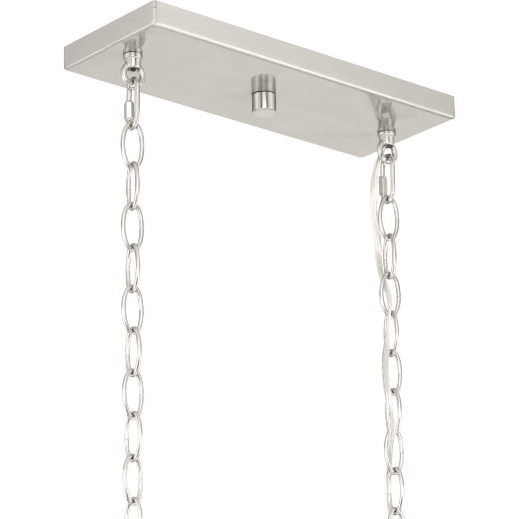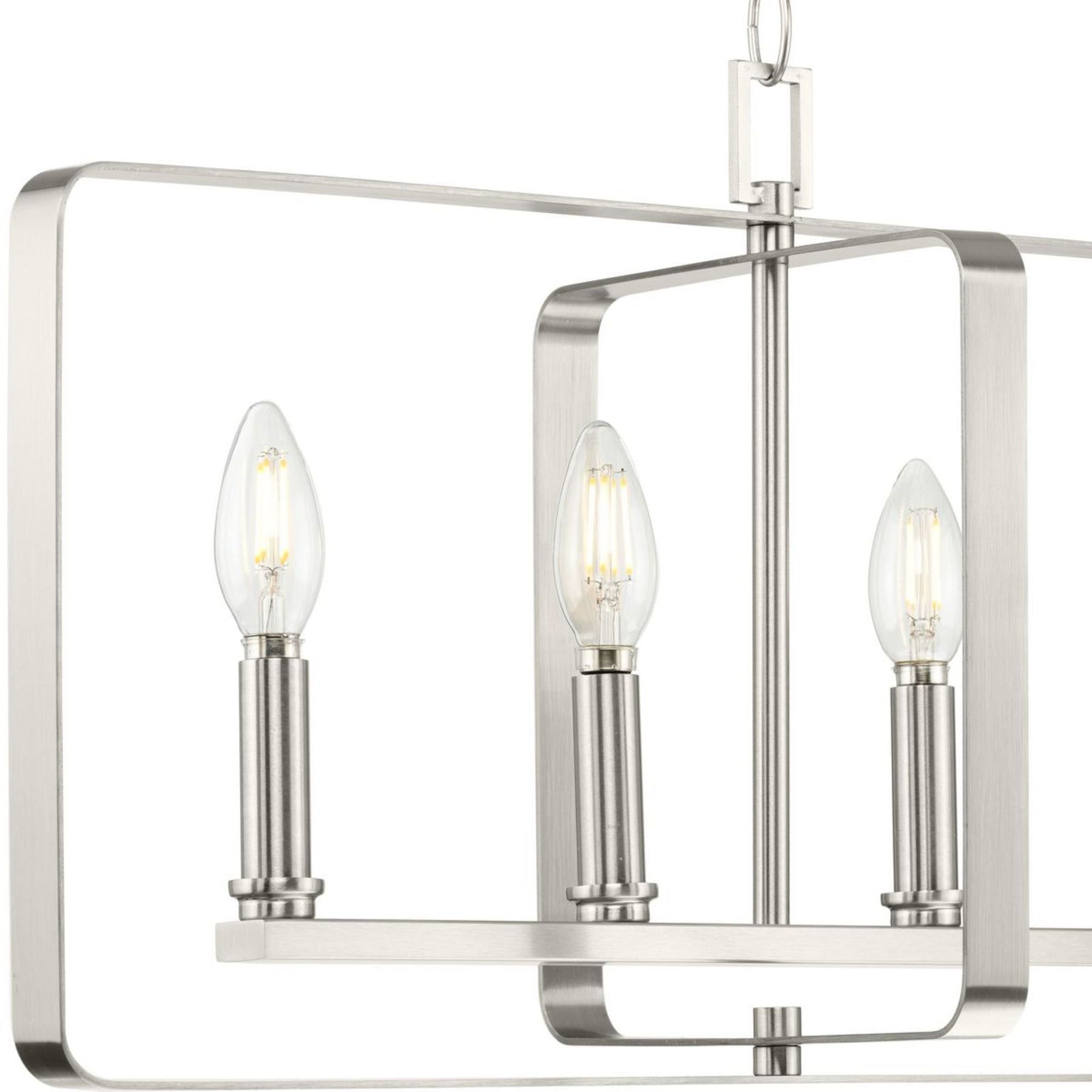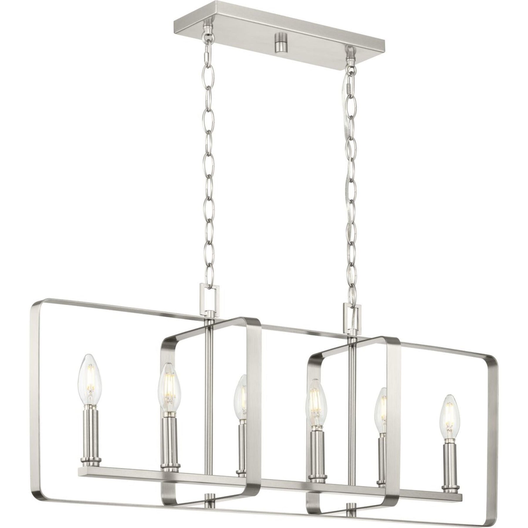 Illuminate your kitchen or dining area with the stunning McColl 6-Light Brushed Nickel Linear Island Light from Progress Lighting. Its open design and softly rounded rectangular frame provide a captivating aesthetic, while delivering exceptional brightness to enhance any transitional space. Crafted from durable steel and coated with a sleek brushed nickel finish, this fixture combines elegance with functionality.