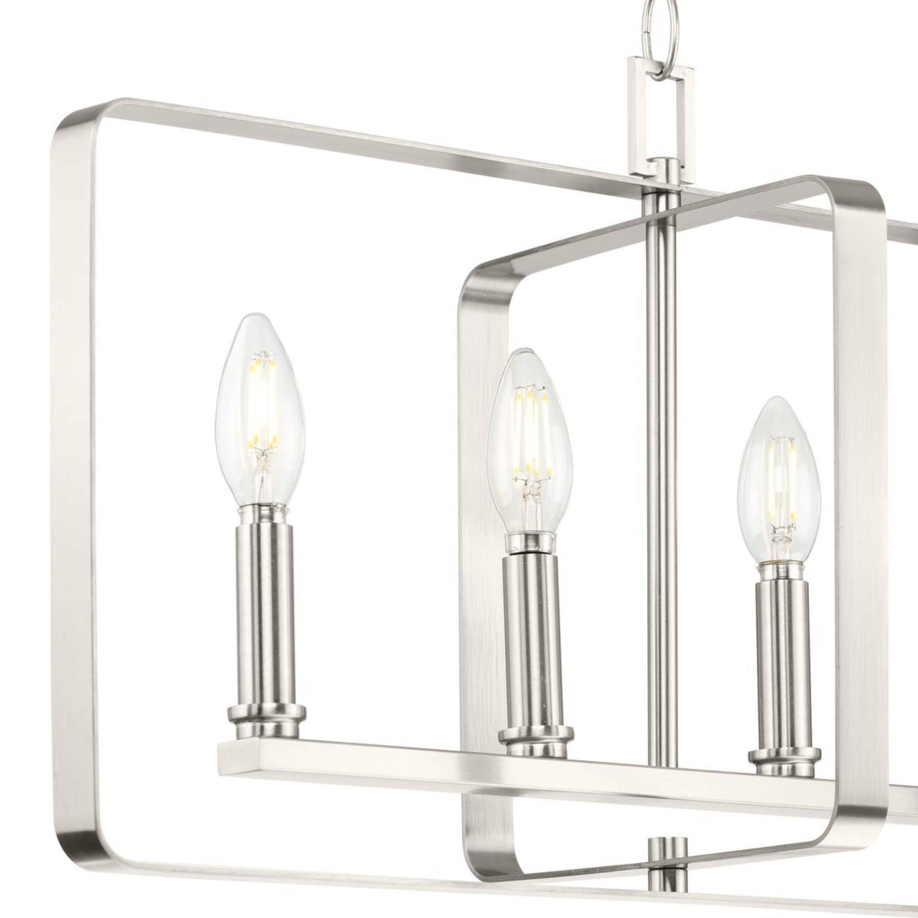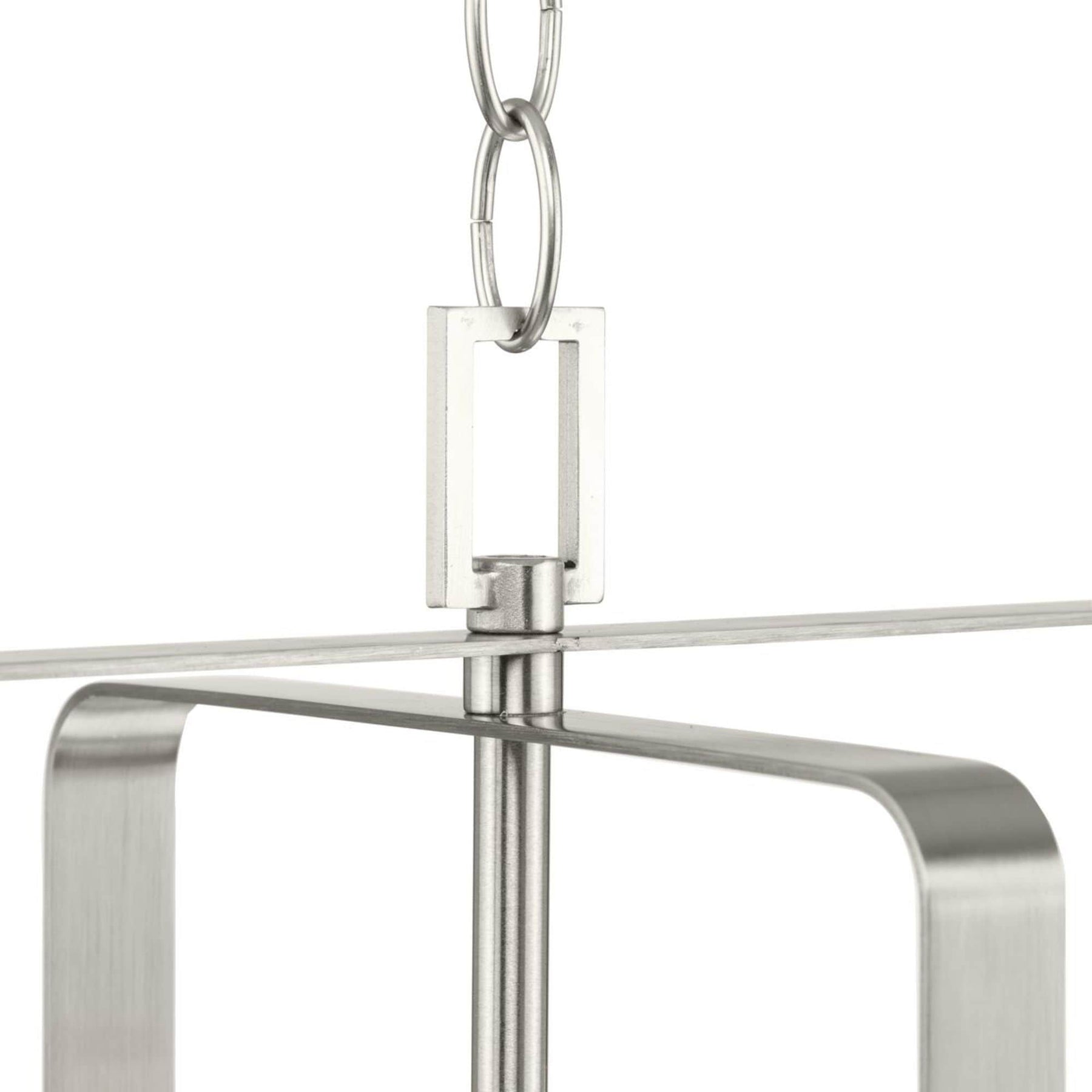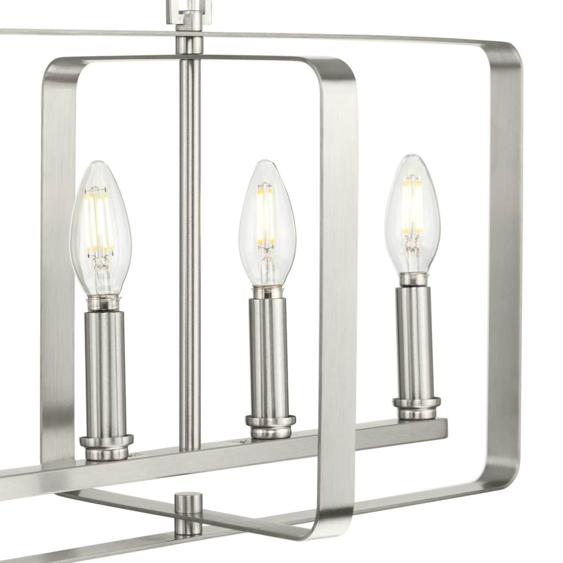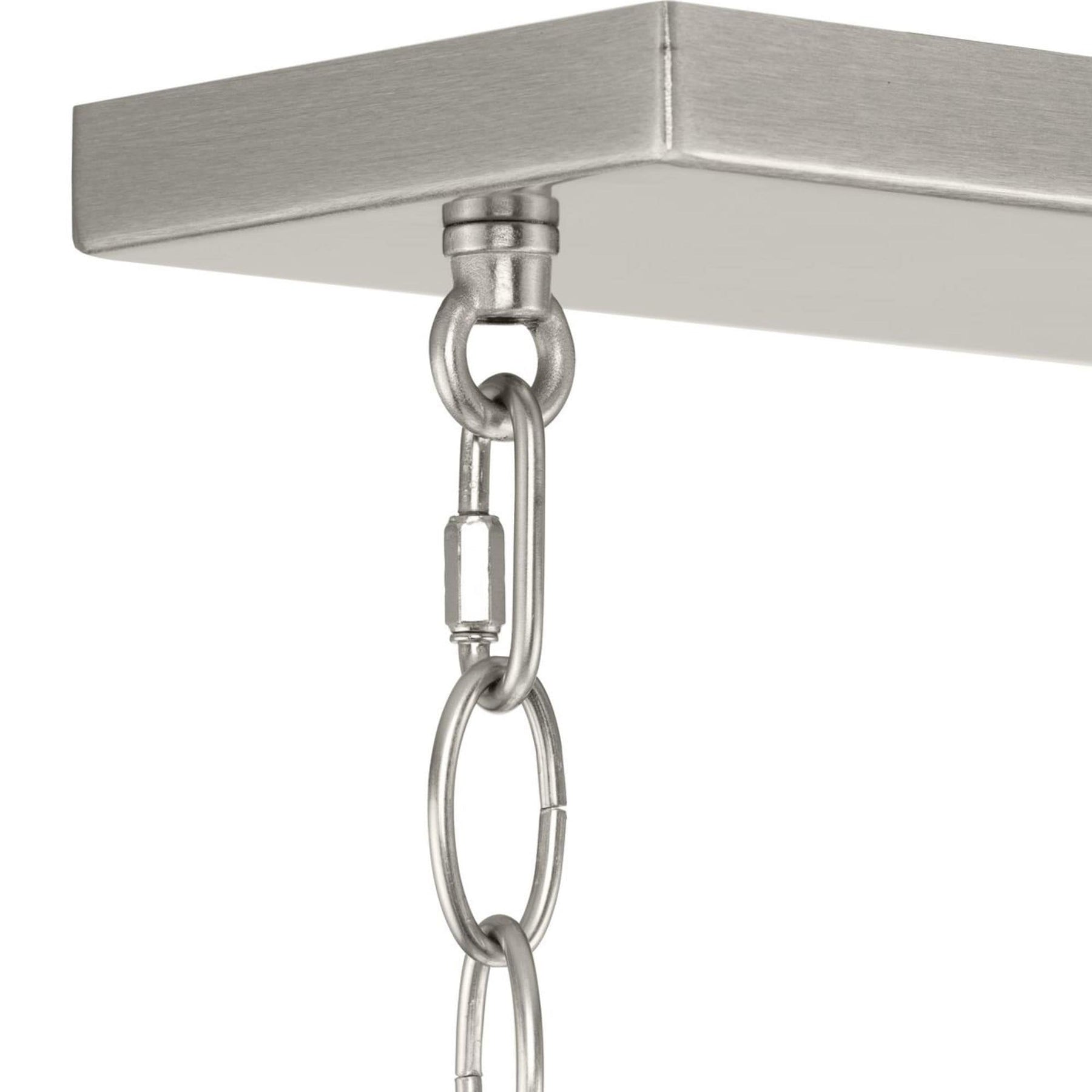 Illuminate your kitchen or dining area with the stunning McColl 6-Light Brushed Nickel Linear Island Light from Progress Lighting. Its open design and softly rounded rectangular frame provide a captivating aesthetic, while delivering exceptional brightness to enhance any transitional space. Crafted from durable steel and coated with a sleek brushed nickel finish, this fixture combines elegance with functionality.