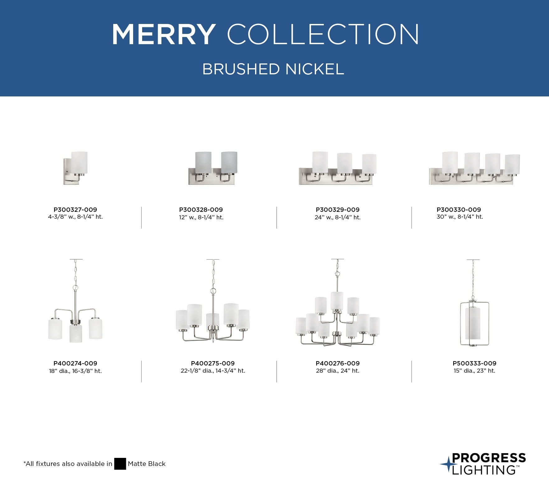 Illuminate your space with the elegant Merry 9-Light Brushed Nickel Chandelier from Progress Lighting. Designed to enhance transitional and contemporary settings, this fixture offers a sophisticated blend of form and function with its crisp etched glass shades and durable steel construction. Perfect for dining rooms, kitchens, and living areas, it promises to transform any room with a modern ambiance.