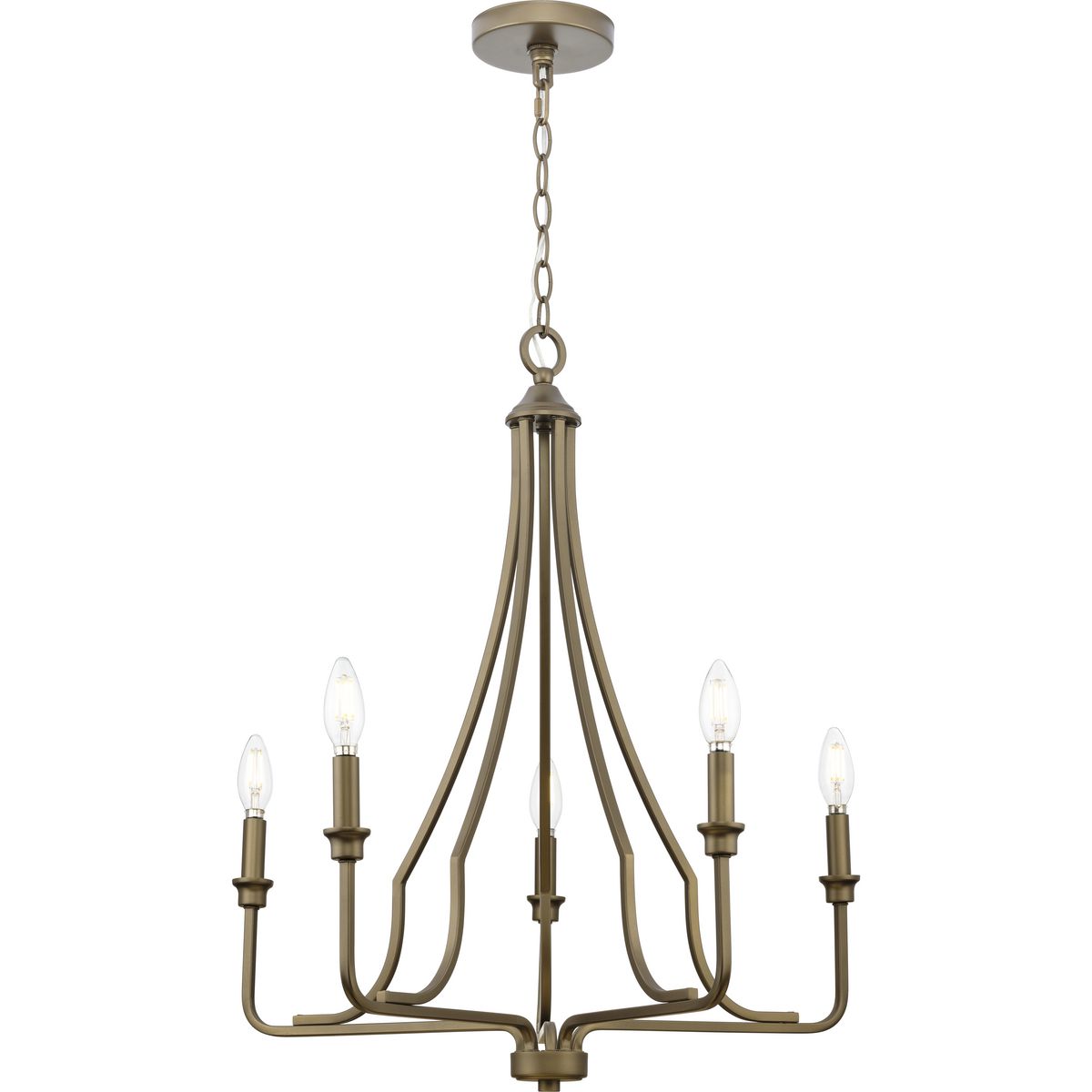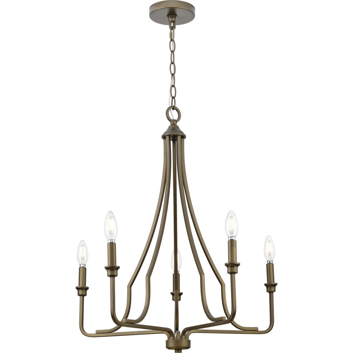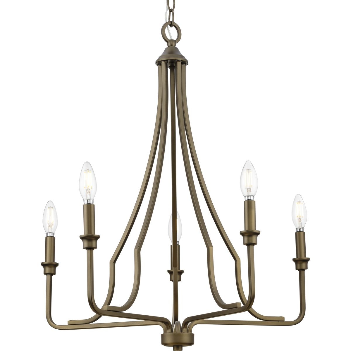 Illuminate your space with the sophisticated Myerly 5-Light Chandelier by Progress Lighting. Perfect for traditional settings, this fixture features a chic basket-style frame with a weathered brass finish, casting ambient light from elegant candlesticks on an airy design. Ideal for dining areas, foyers, or living rooms, this chandelier blends timeless elegance with modern functionality.