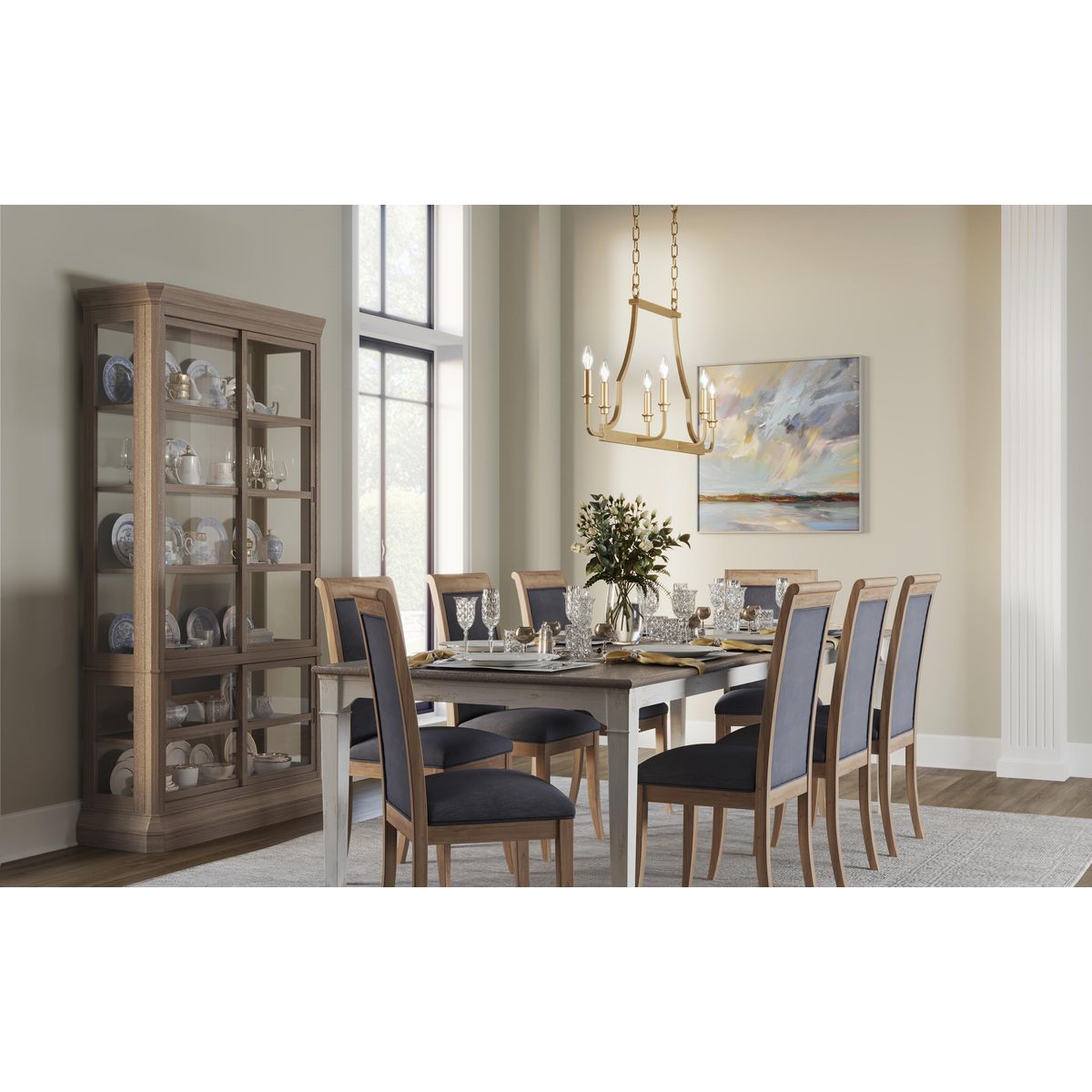 The Myerly 6-Light Chandelier casts a luminous glow that exquisitely transforms any dining or kitchen space into a realm of sophistication. Its sleek, open frame adorned with elegant candlesticks against a luxurious champagne bronze finish creates an air of modern grandeur. Consider pairing it over a rustic oak dining table to heighten the contrast and accentuate its contemporary charm. This chandelier is not merely functional; it exudes an aura of opulence essential to any refined interior.